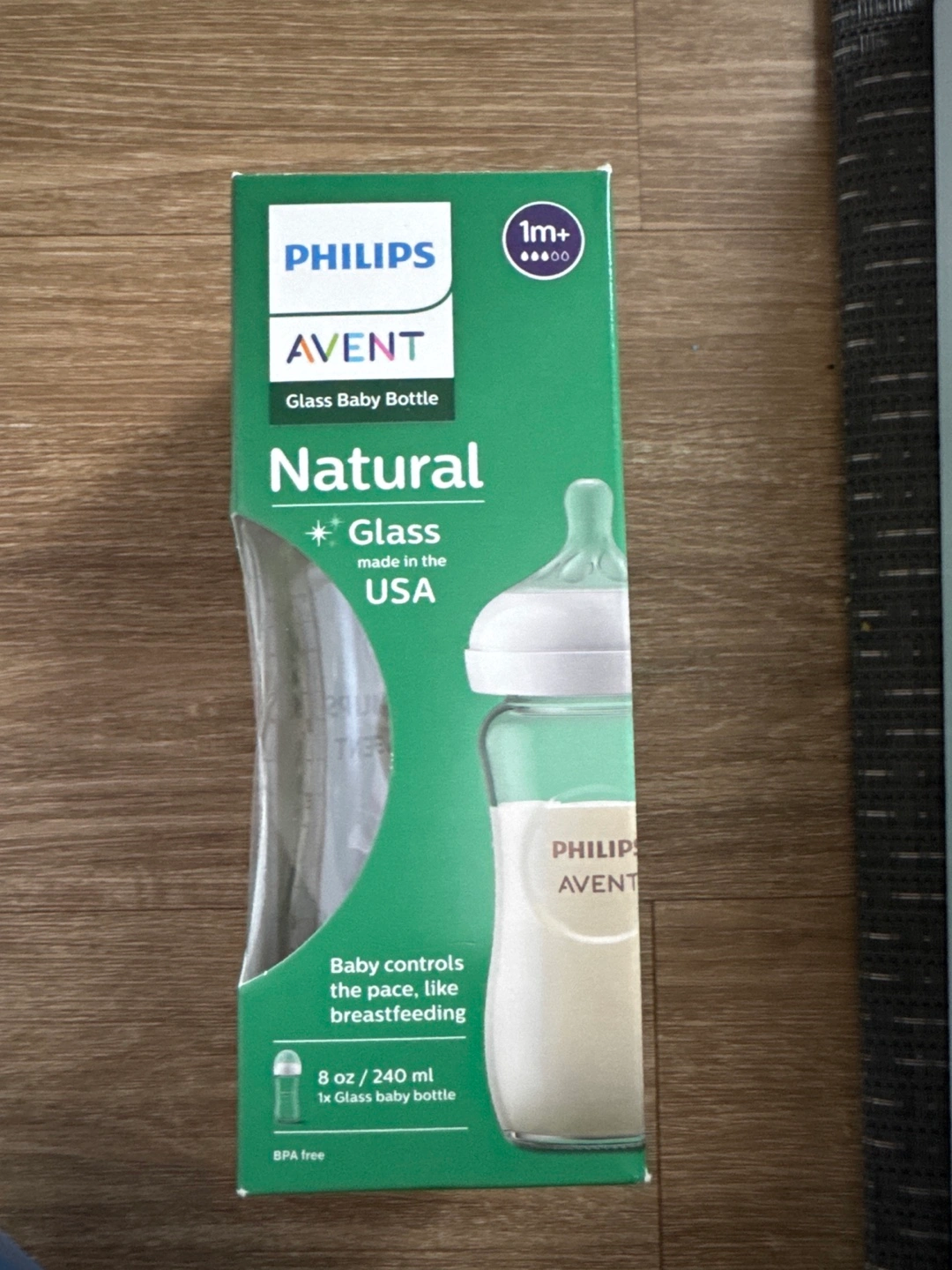 Selling a Philips Avent Natural glass baby bottle, suitable for babies 1 month and older. This bottle is BPA free and holds 8 oz / 240 ml. The design helps babies control the pace, like breastfeeding. It's made with glass in the USA
