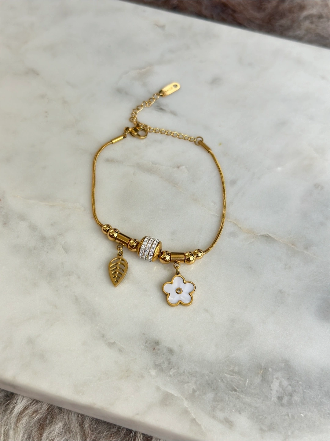 Selling a cute 18k gold plated charm bracelet! It features a flower and leaf charm, making it a sweet accessory for any outfit. The bracelet has an adjustable chain for a comfortable fit
