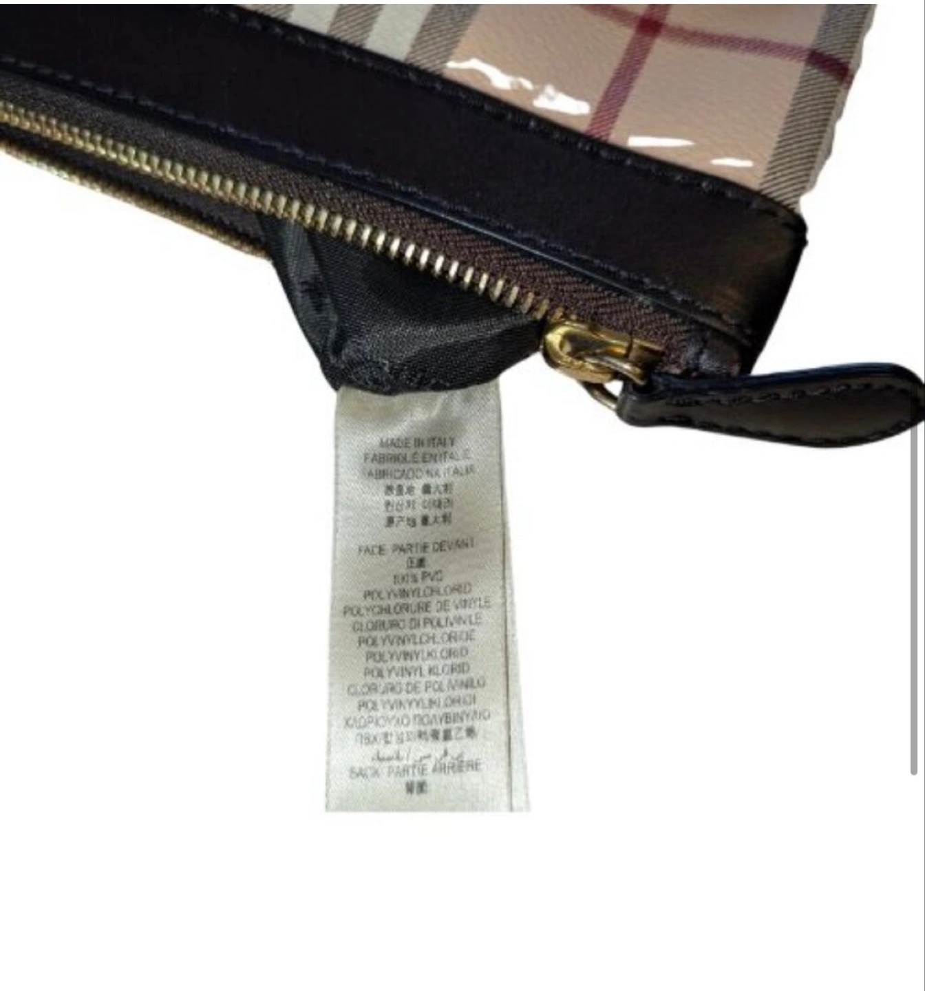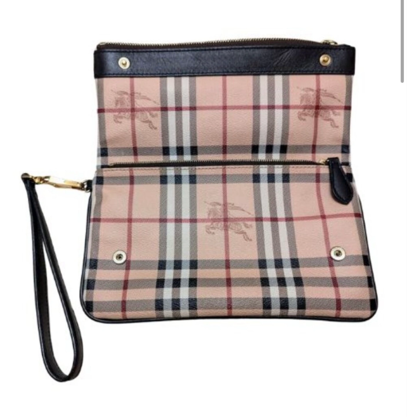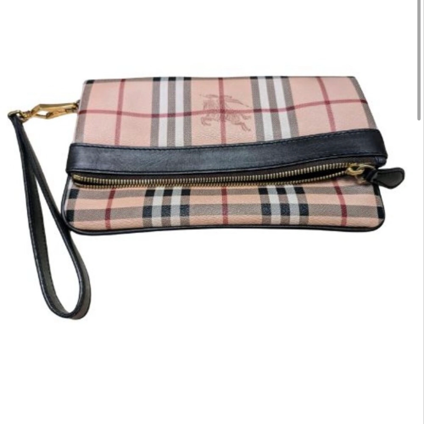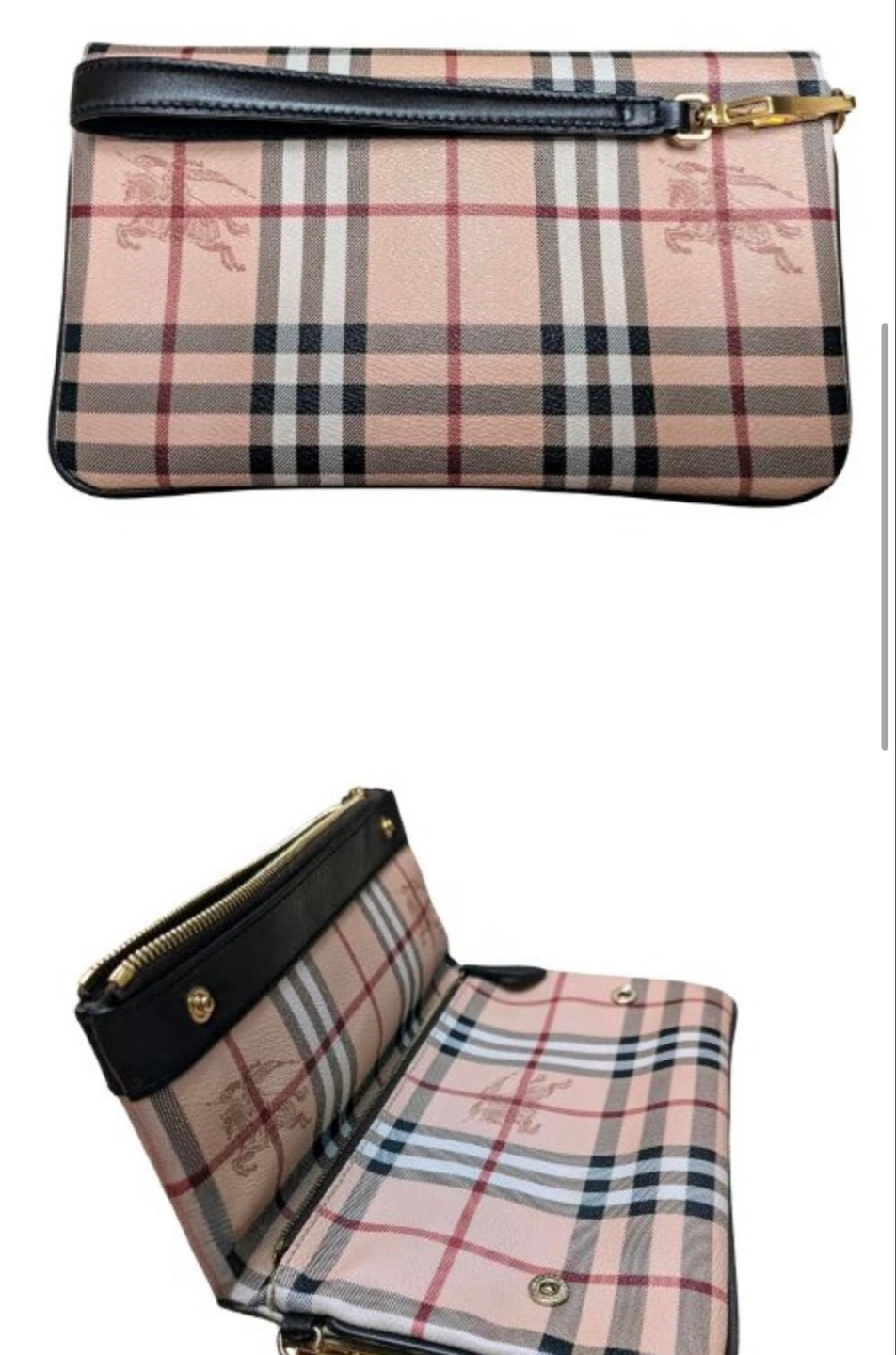 18This Burberry clutch features the classic Burberry check pattern. It has a black leather trim and a wrist strap. The interior is lined with a matching check pattern. Perfect for carrying your essentials in style!