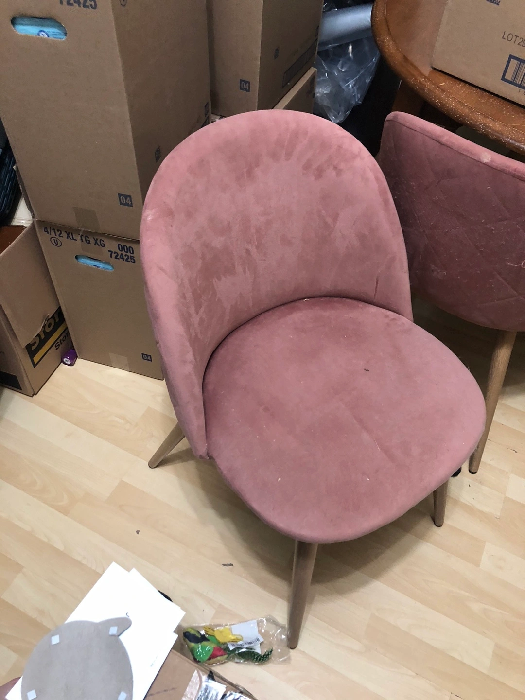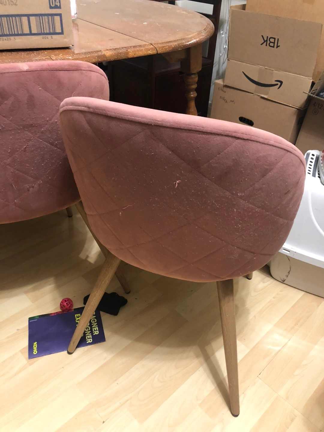 Selling 3 lovely pink velvet accent chair. House with a cat so not the best condition. would look great in any room. The chairs have a unique quilted design on the back part.