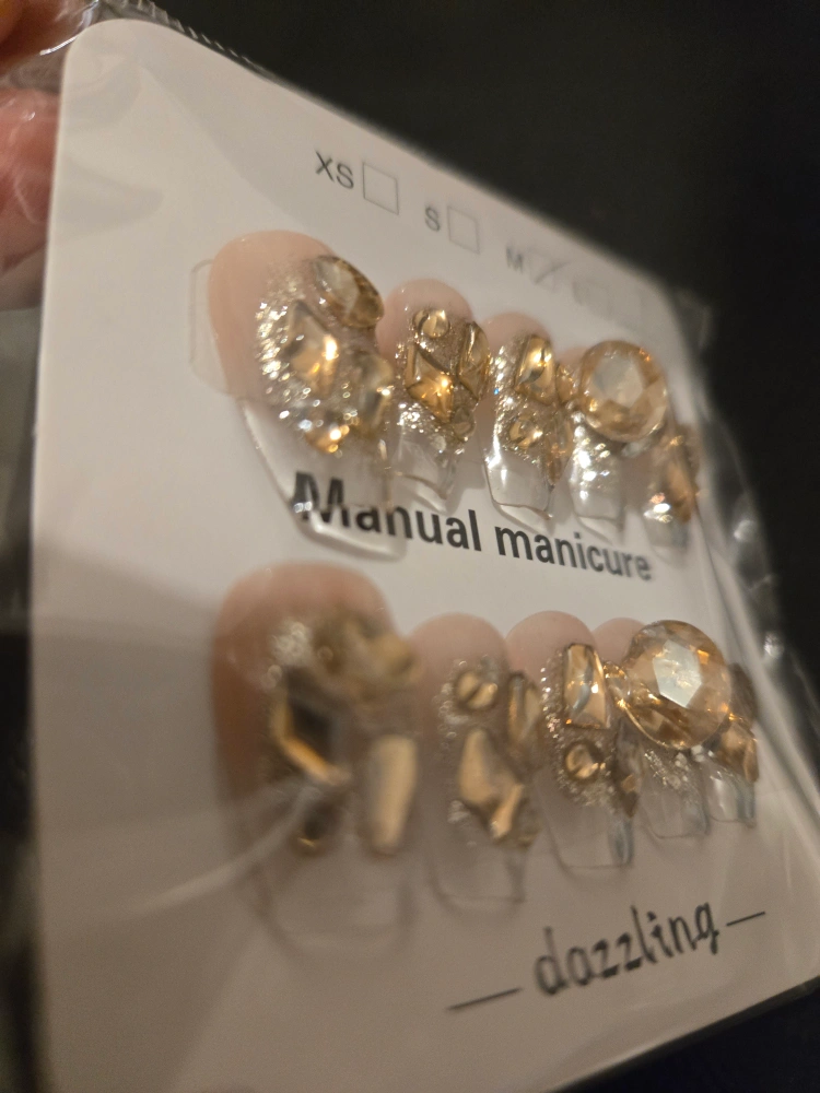 Selling a set of dazzling press-on nails for a manual manicure! These are perfect for adding some sparkle to your look. They come in a set with various sizes to fit different nail beds. Get ready to shine!