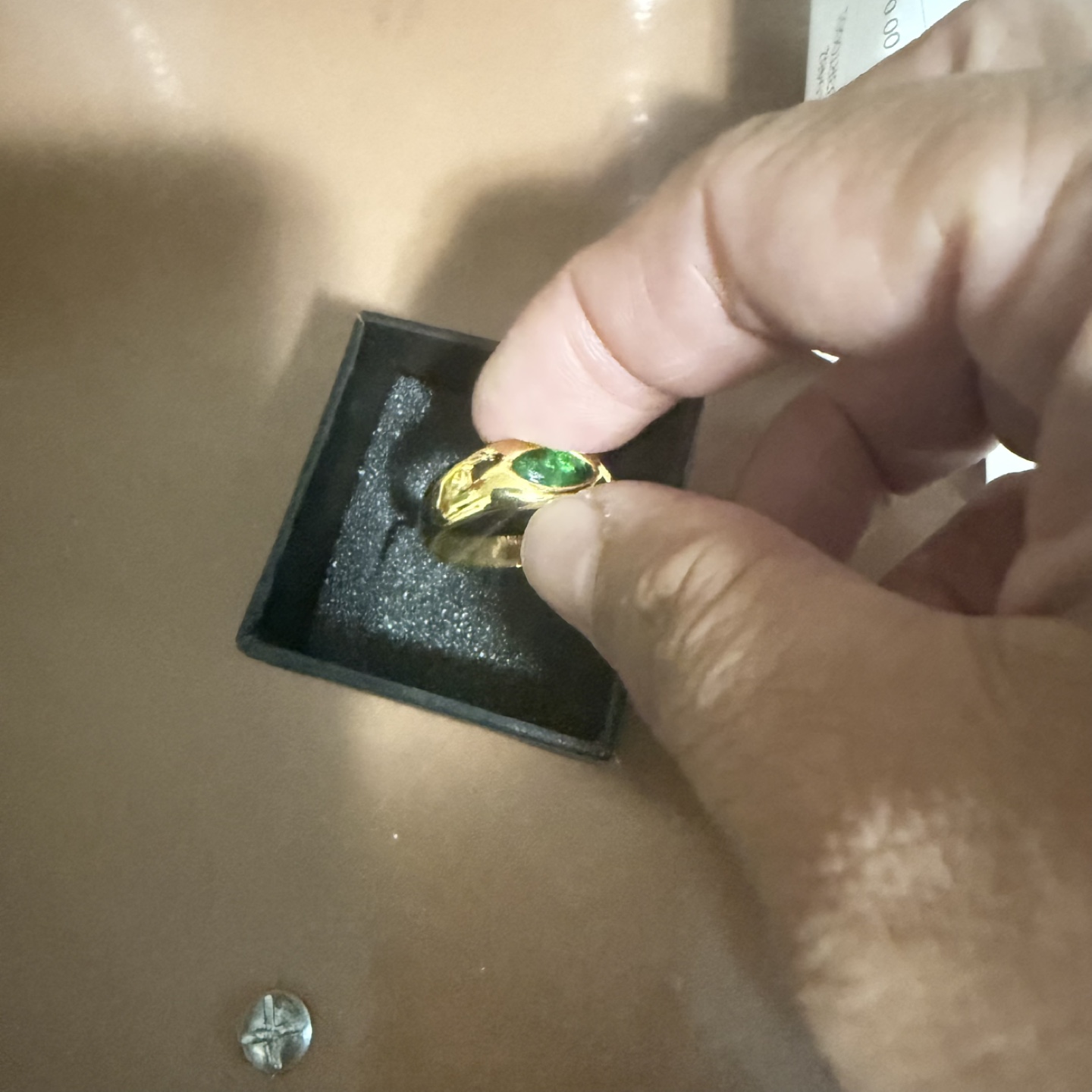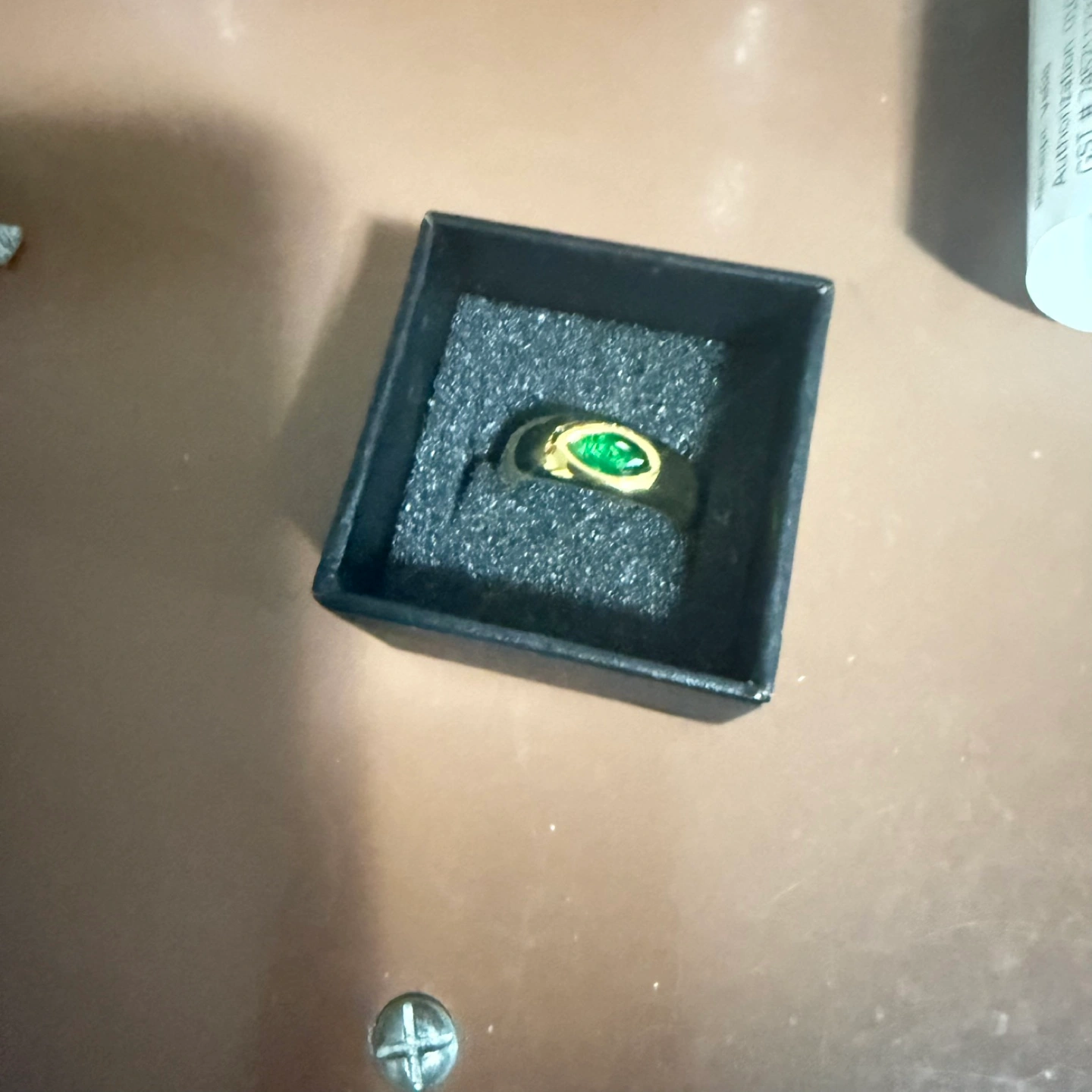 Selling a gold ring featuring a green stone. It comes in a small black box, perfect for gifting or safekeeping. The ring appears to be in good condition and has a unique design. Feel free to ask if you have any questions!