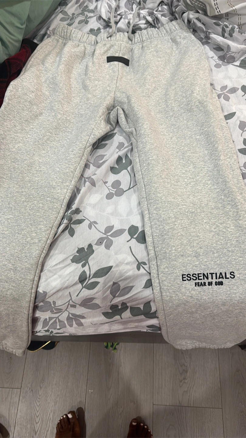 Selling a pair of Essentials Fear of God sweatpants in size XL! They're a comfy grey colour and in great condition. The logo is on the leg. Perfect for lounging or running errands!