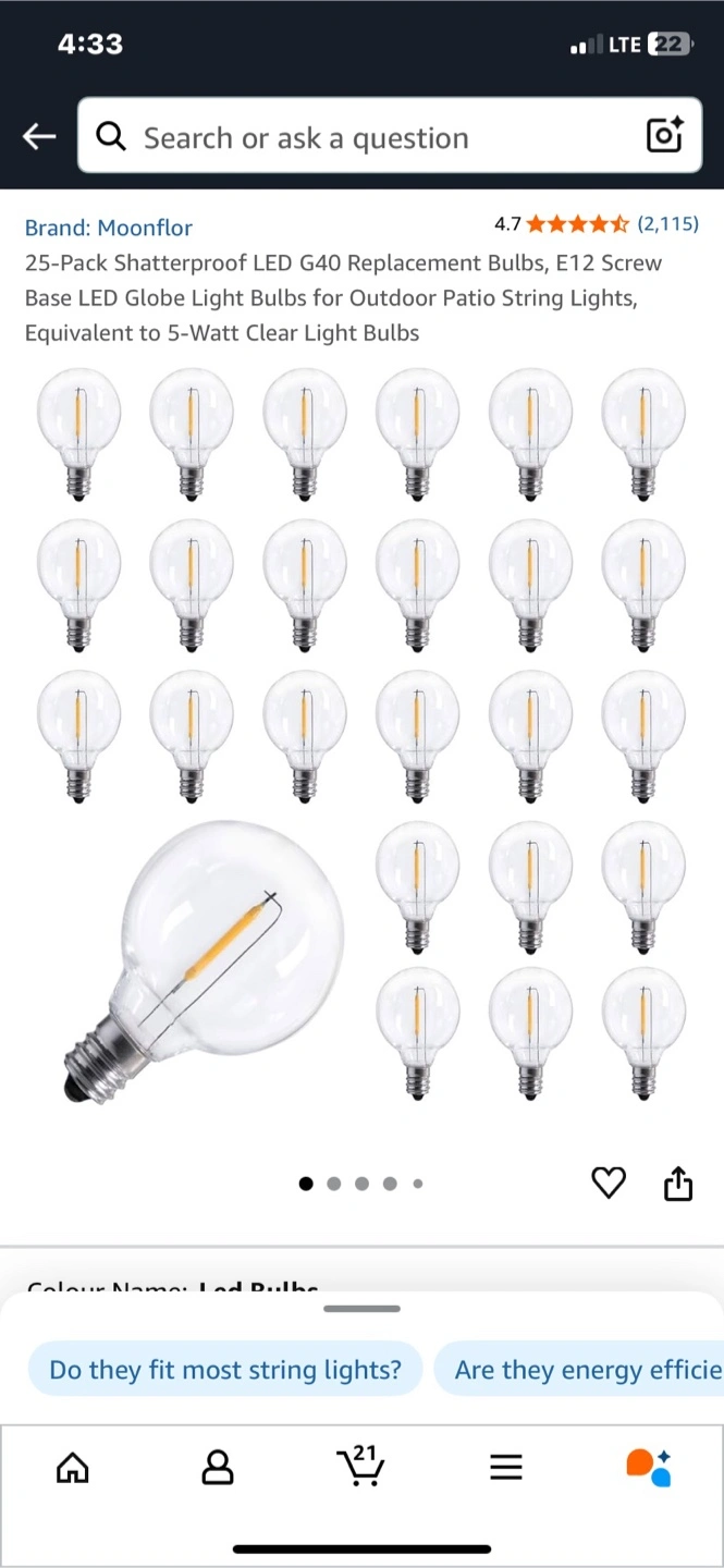 Selling a set of Moonflor G40 LED replacement bulbs! They're shatterproof and have an E12 screw base. Perfect for outdoor patio string lights and are equivalent to 5-Watt clear light bulbs