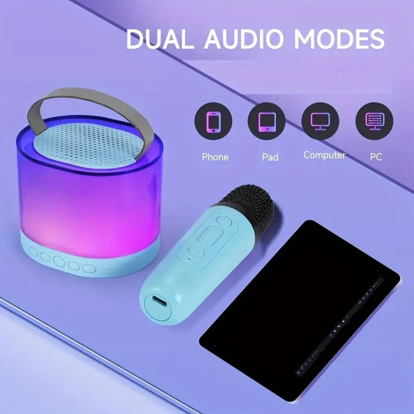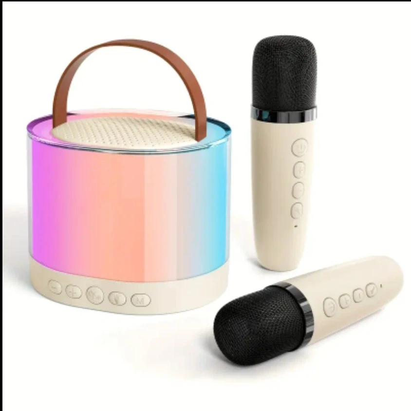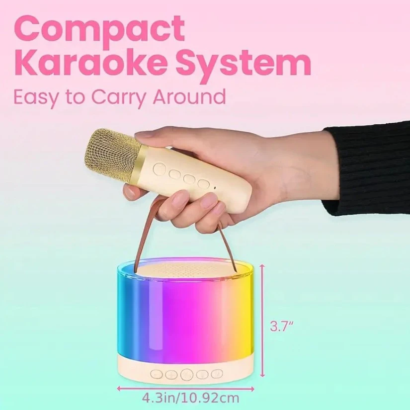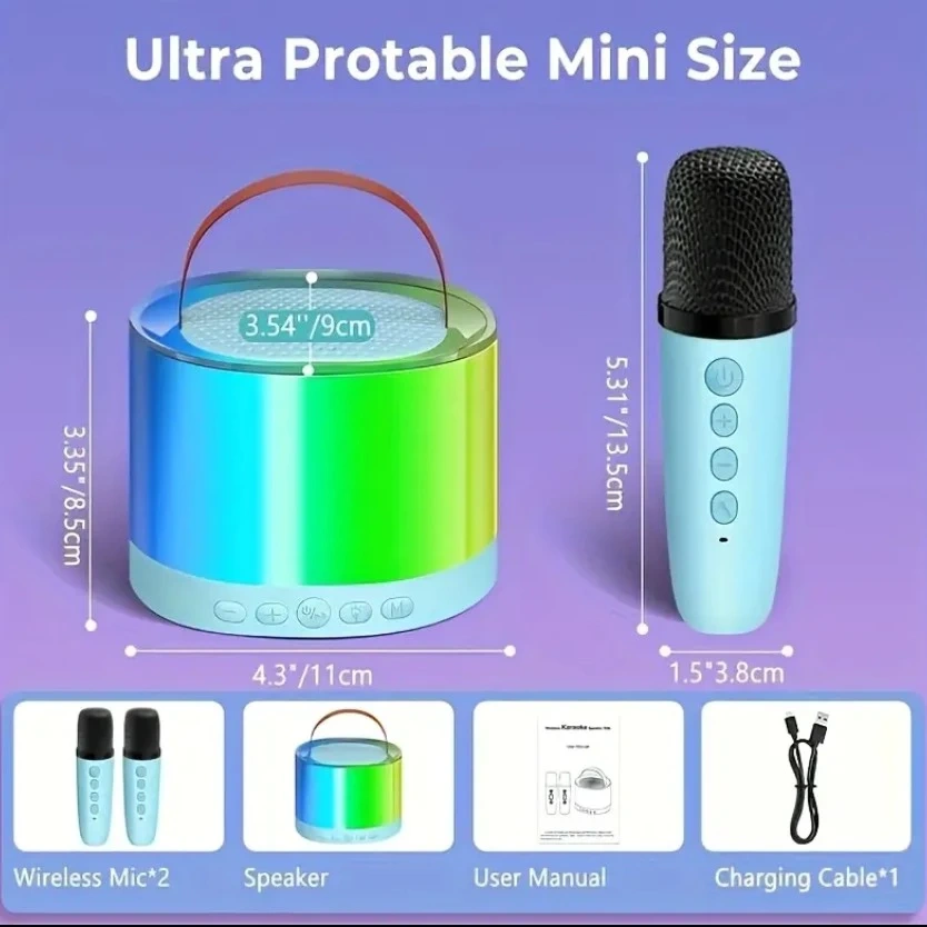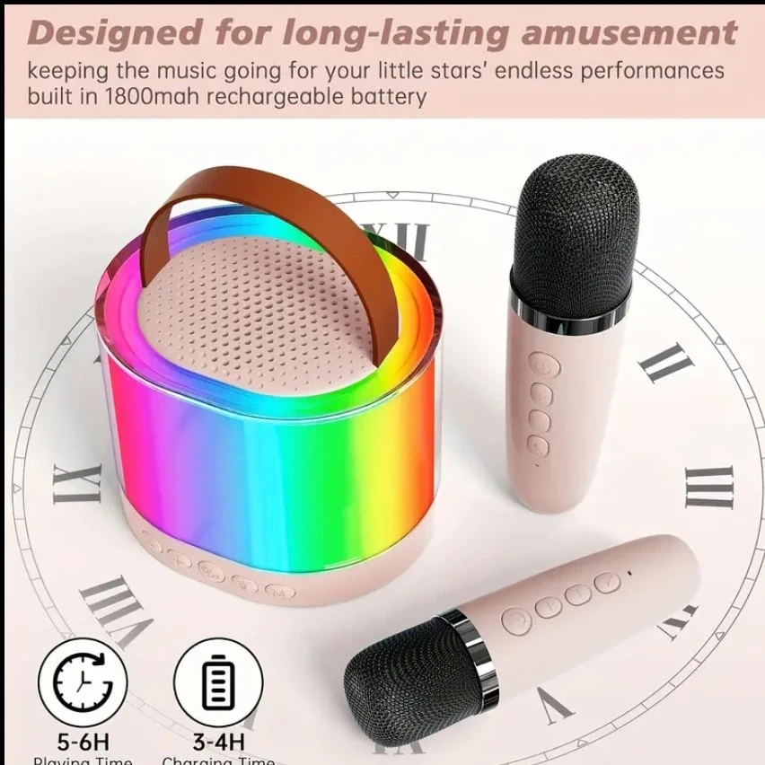 Get ready to sing your heart out with this compact karaoke system! It's easy to carry around, perfect for on-the-go fun. The dimensions of the speaker are approximately 4.3 inches in diameter and 3.7 inches in height. It features dual audio modes and comes with two wireless microphones, a user manual, and a charging cable. Designed for long-lasting amusement, it keeps the music going for your little stars' endless performances with its built-in 1800mAh rechargeable battery. You can enjoy 5-6 hours of playing time and 3-4 hours of charging time.