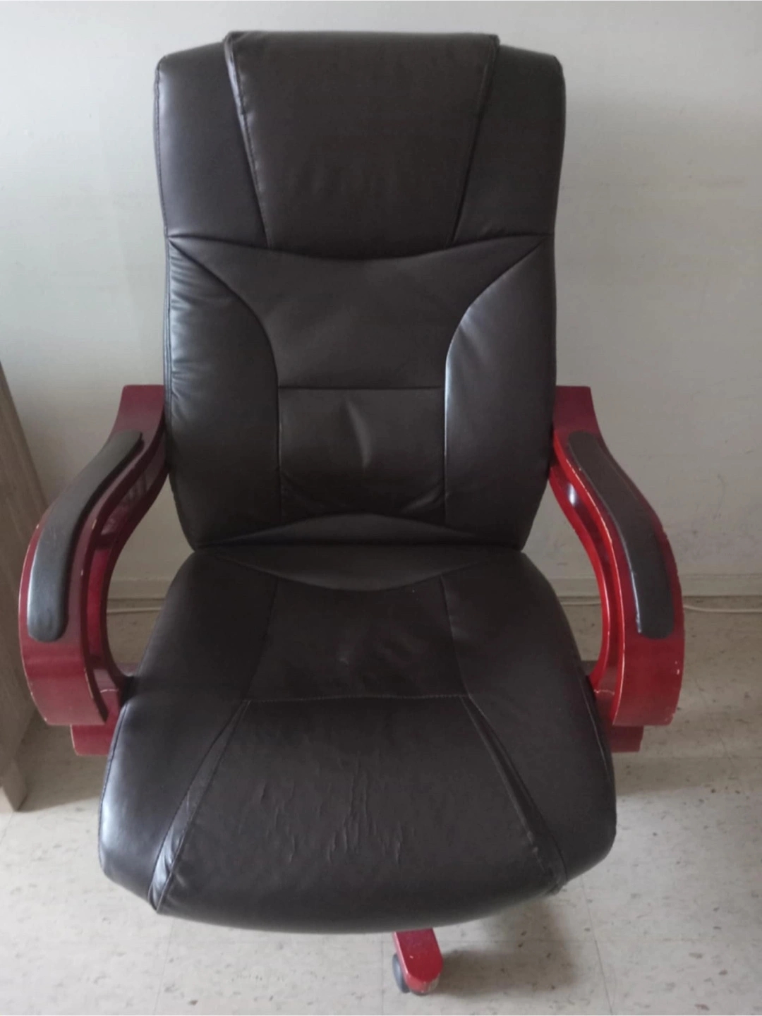 Here's a comfy brown leather office chair! It has a high back for good support and red armrests. There are some signs of wear on the seat, but it's still perfectly functional and screws in the armchair are loose. There are screws missing. The product is in downtown area of my place. Only pick up.