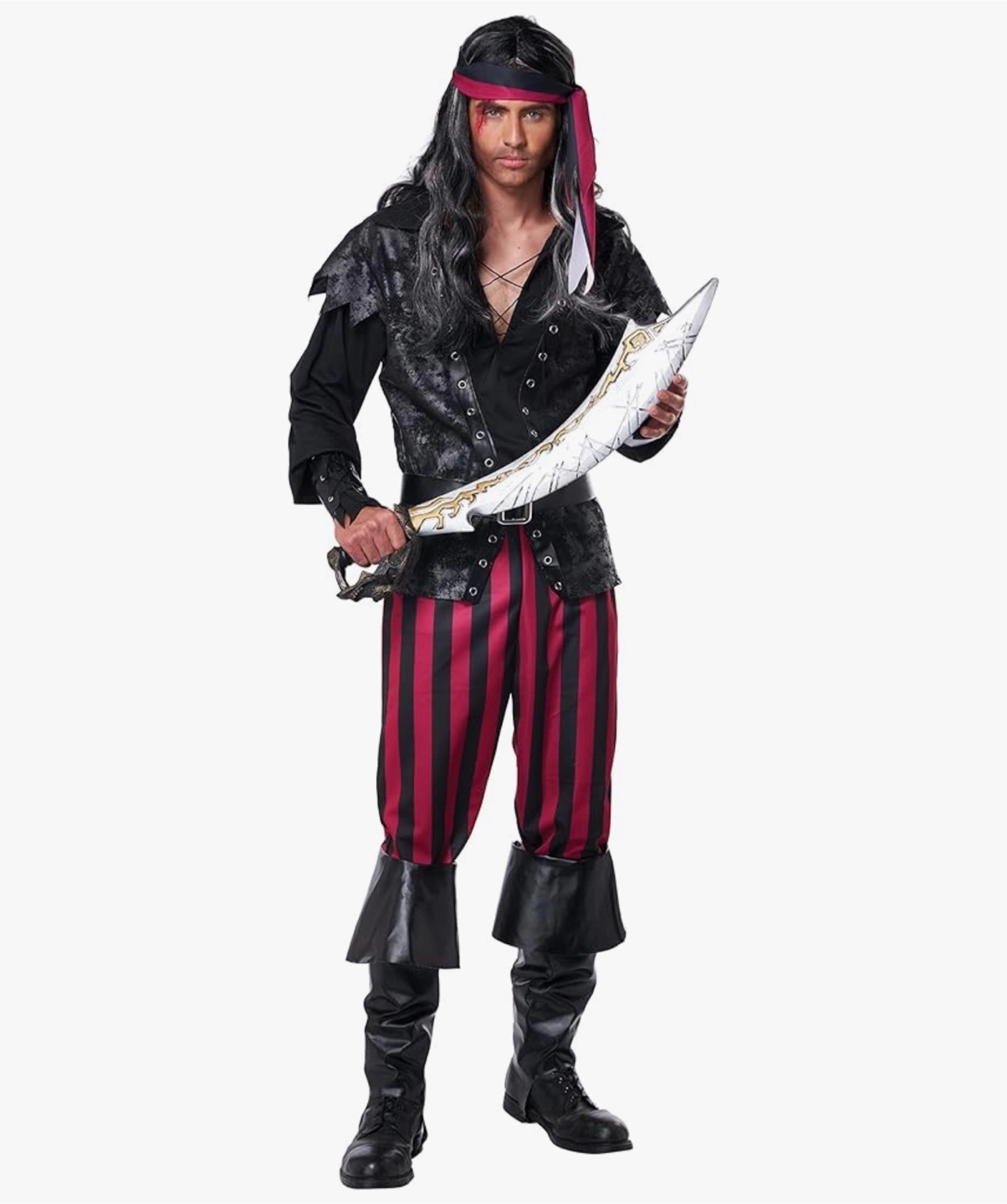 Men's Ruthless Rogue Pirate Costume Brand new / never worn Size Medium Includes: Shirt with vest, pants, head tie, wrist cuffs, belt, boot covers. Not included: Wig, eyepatch, sword, shoes.