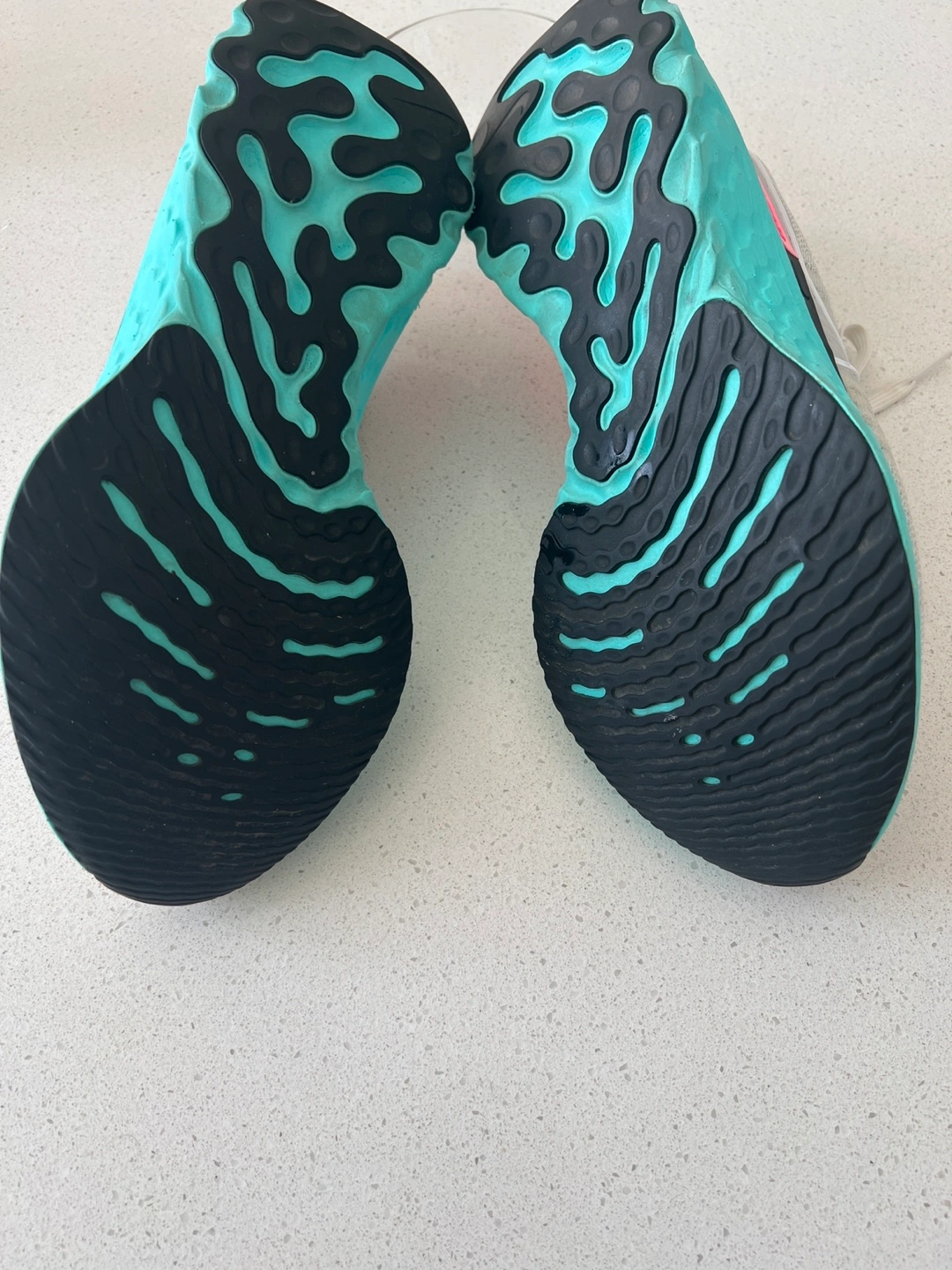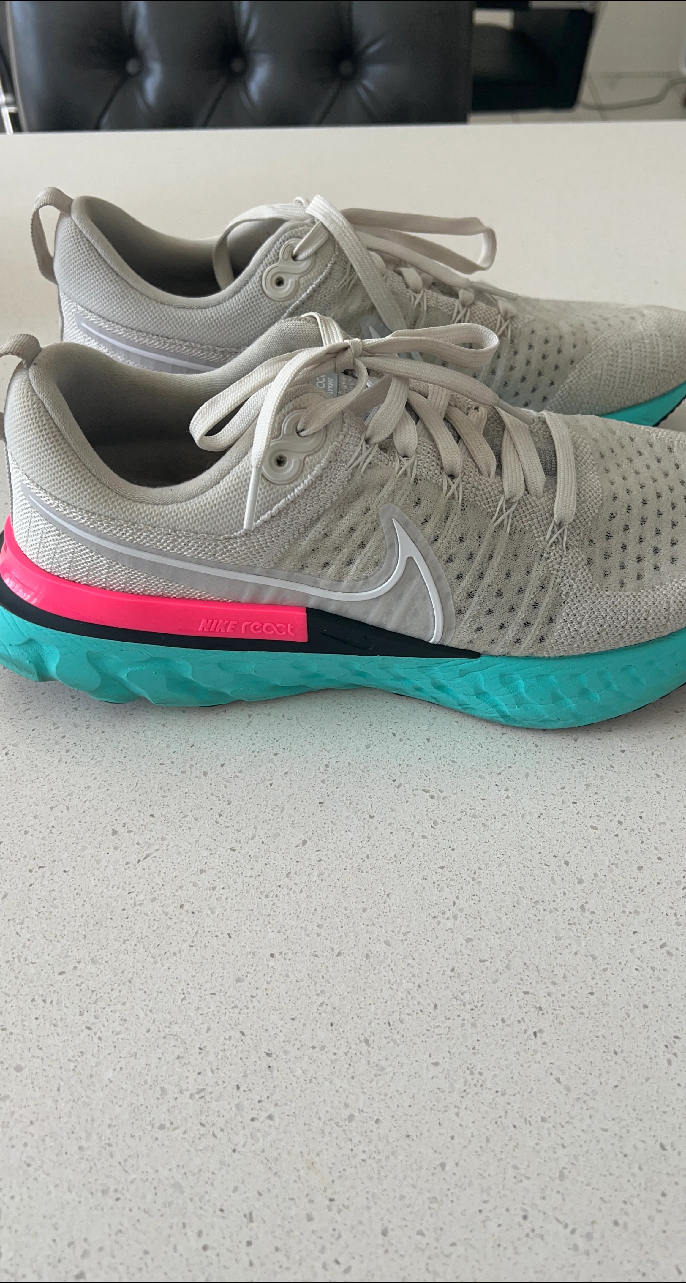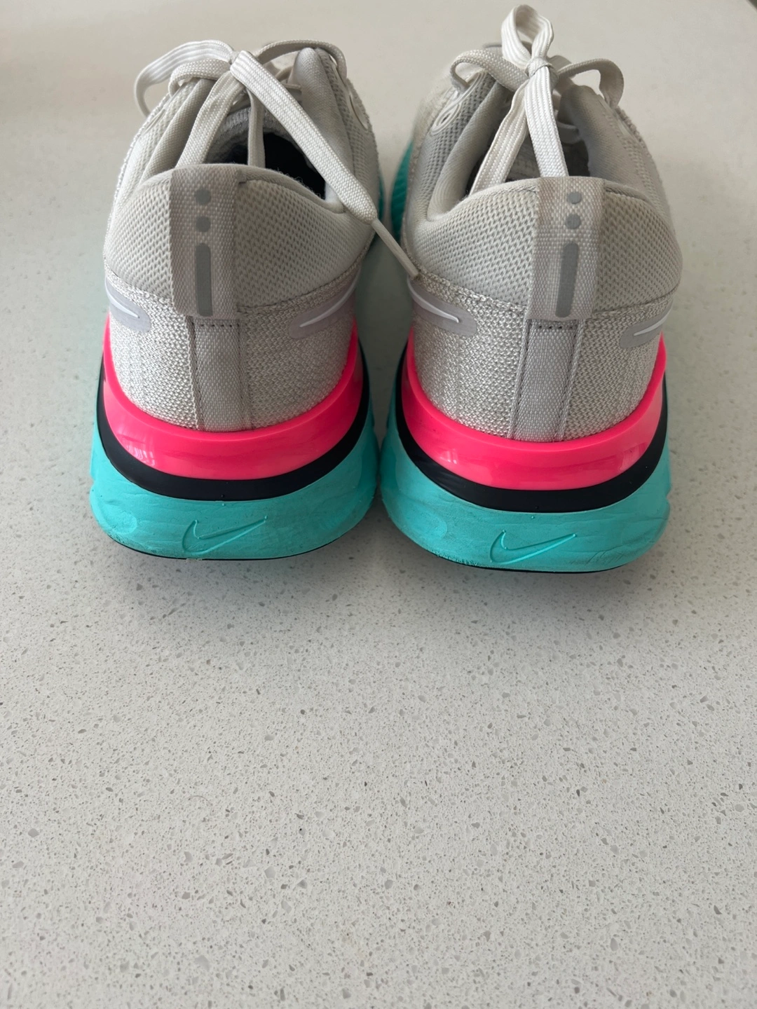 Selling a pair of Nike React Infinity Run Flyknit 3 Men’s running shoes in size 11. They are in good condition and have a unique colour combination with a light grey beige , turquoise sole, and pink detailing. Perfect for running or casual wear!