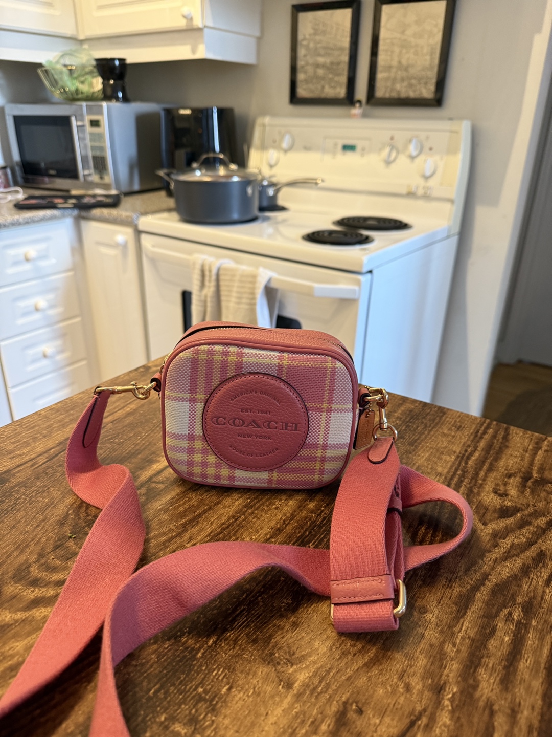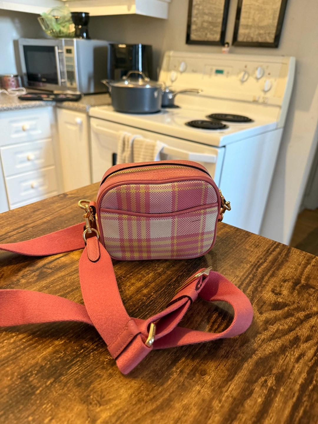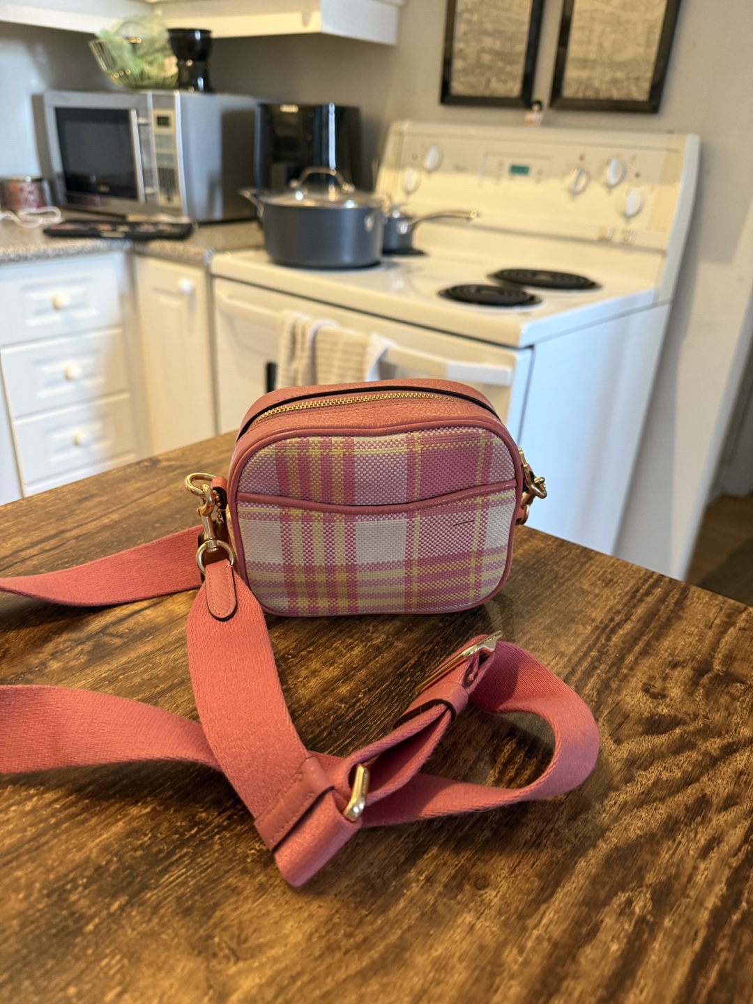 Selling a cute Coach camera bag! It's in great condition and has a fun plaid print. The colour is a lovely pink. Barely used, got as a gift.