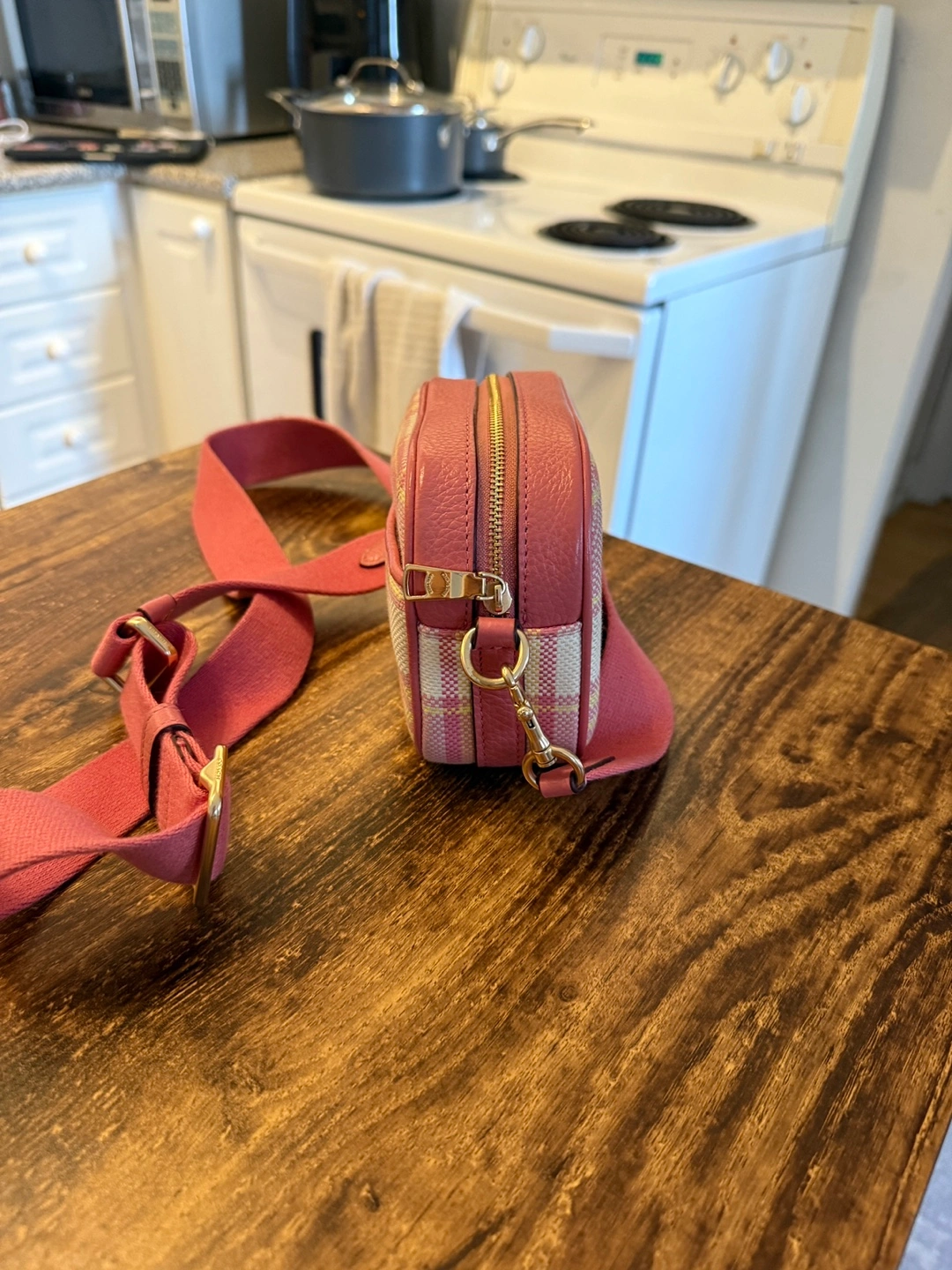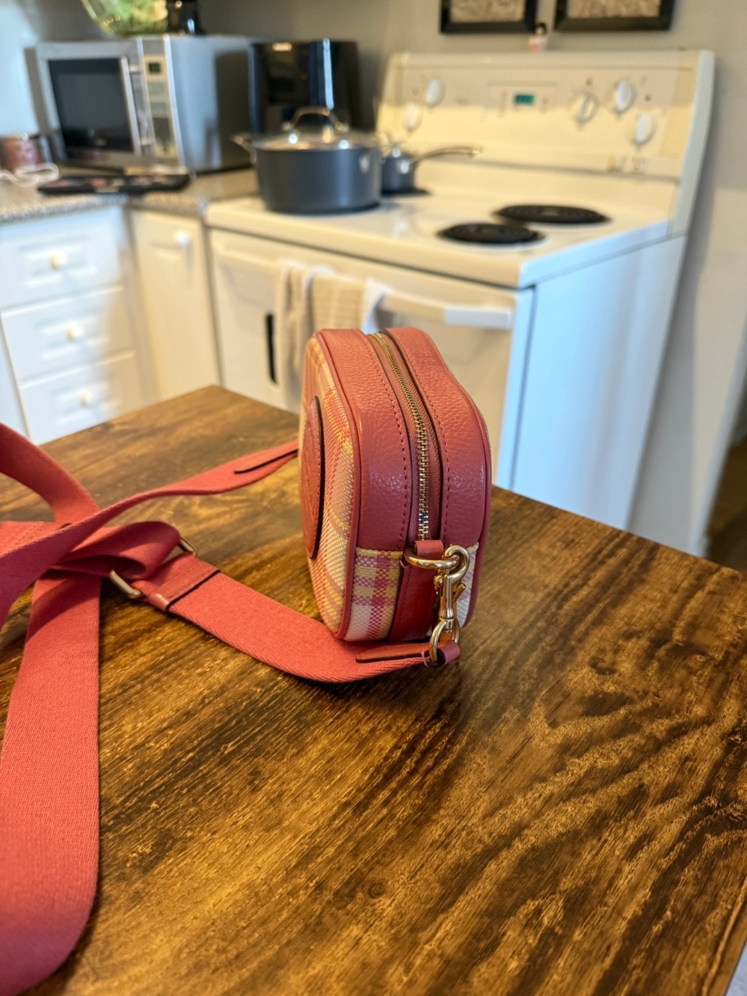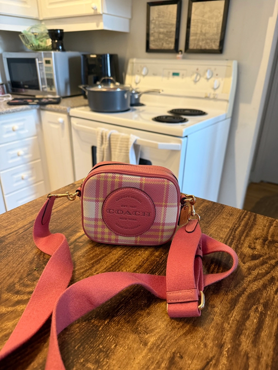 Selling a cute Coach camera bag! It's in great condition and has a fun plaid print. The colour is a lovely pink. Barely used, got as a gift.