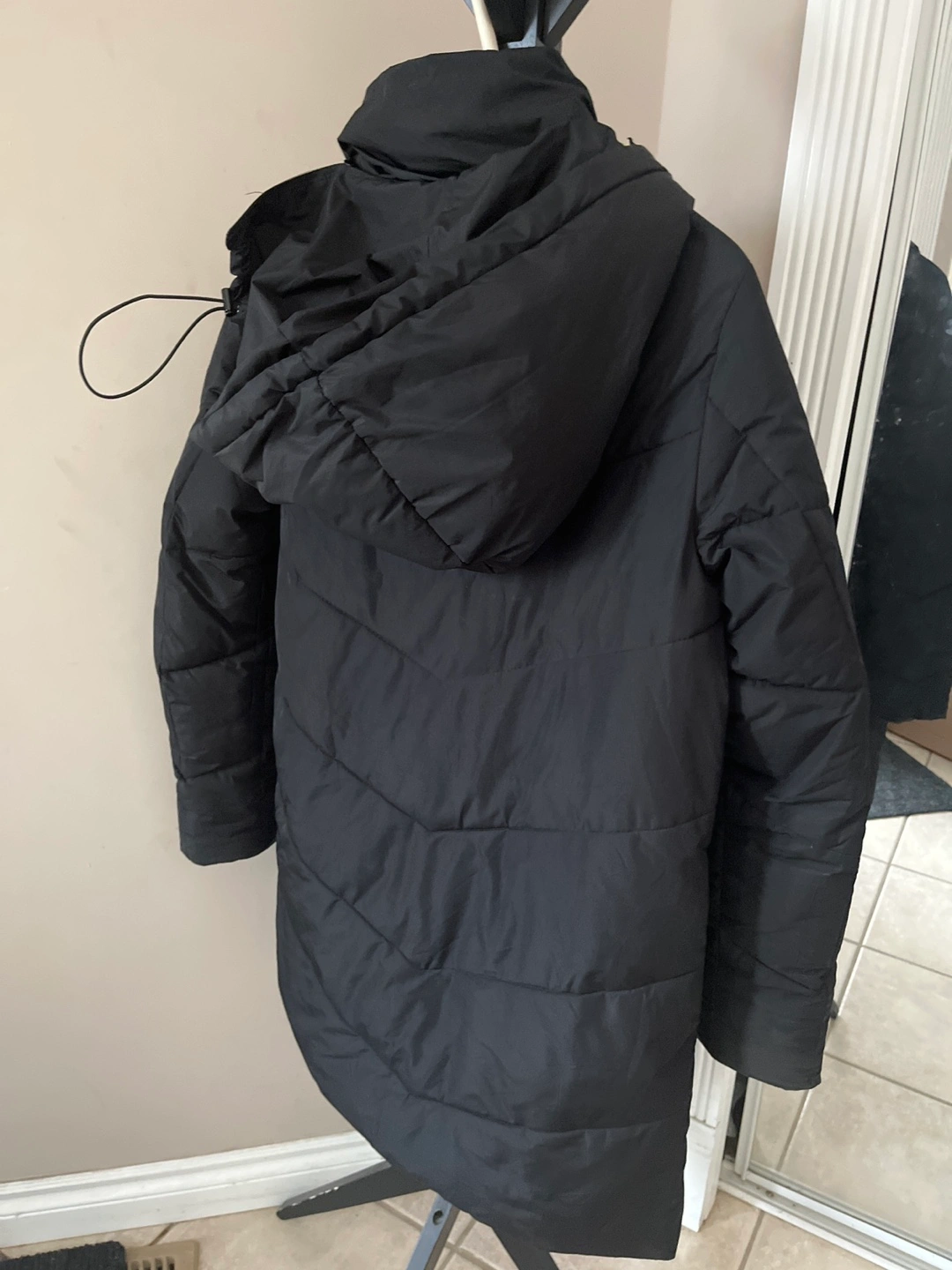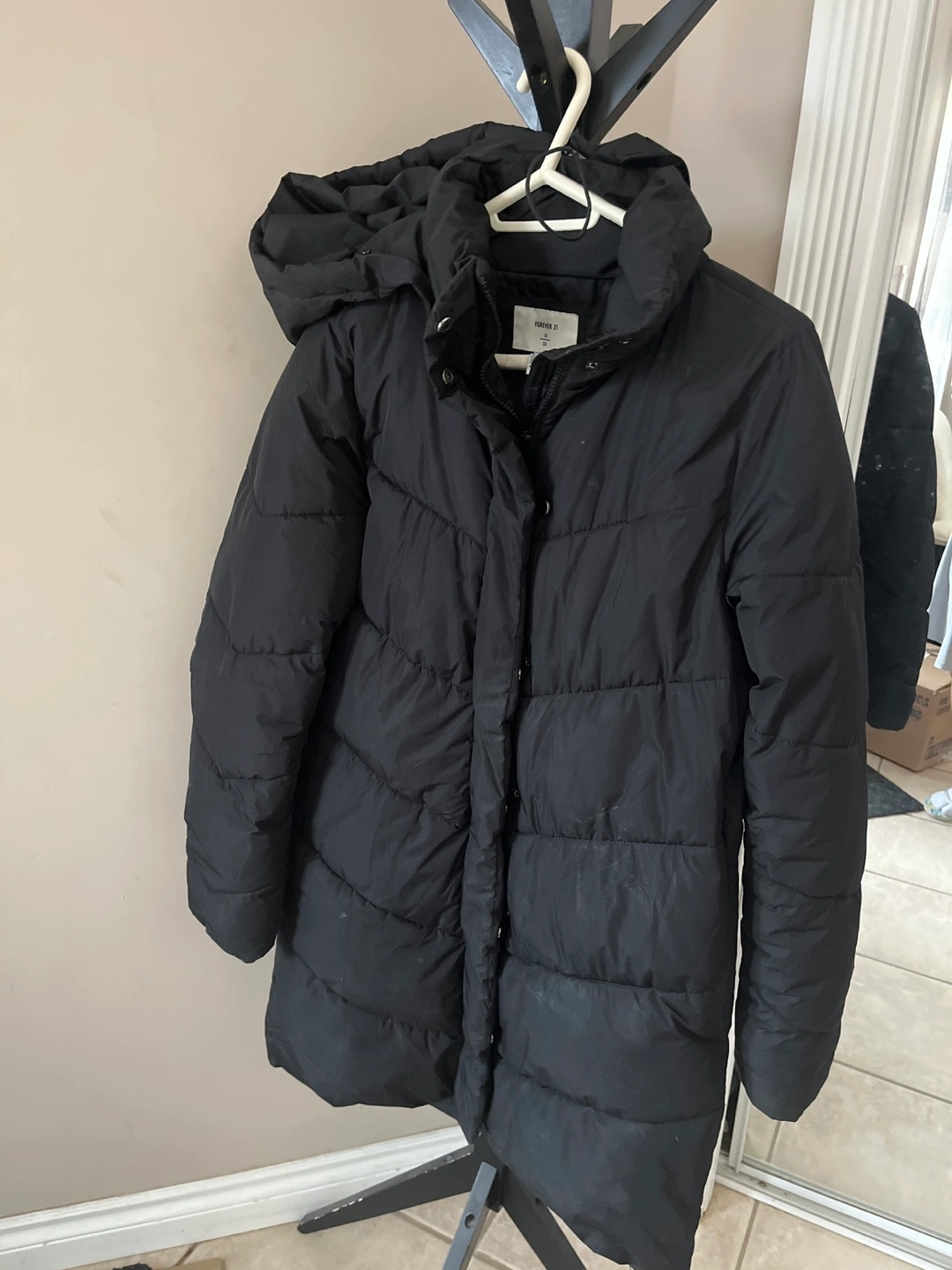 Cozy Forever 21 puffer jacket in black, perfect for the cooler weather! It's a size small and in great condition. It's a stylish and warm choice for everyday wear