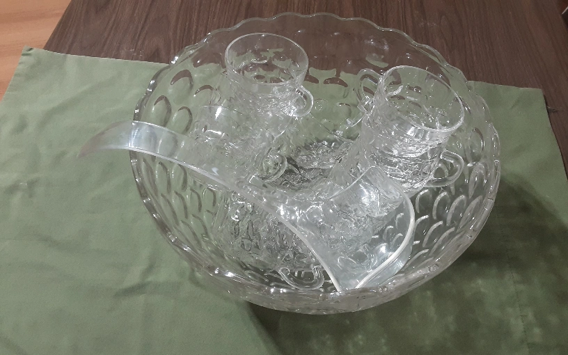 Selling a lovely punch bowl set! It includes a large punch bowl, several cups, and a ladle. Perfect for parties and gatherings. The set is in great condition and ready to be used for your next event