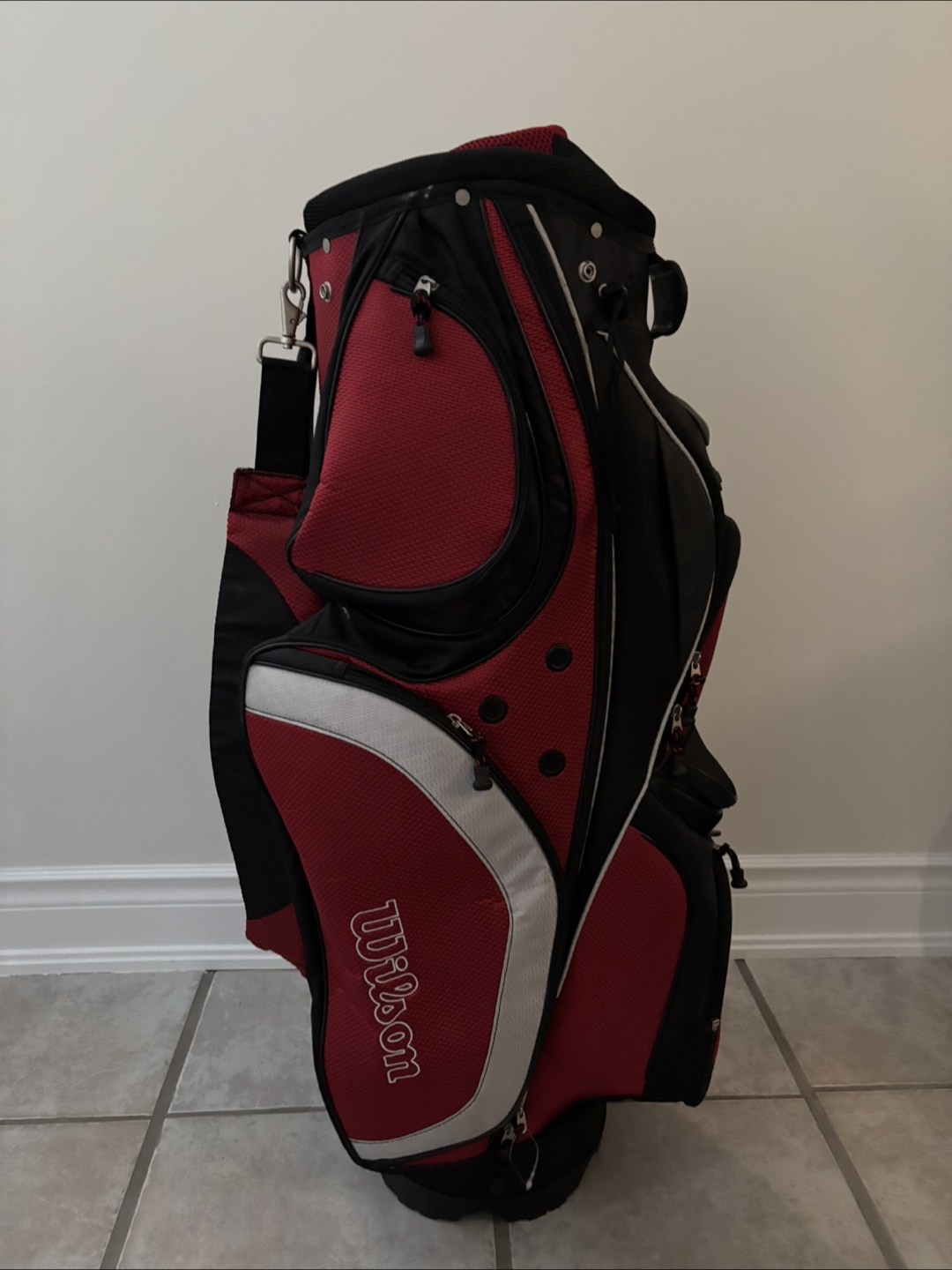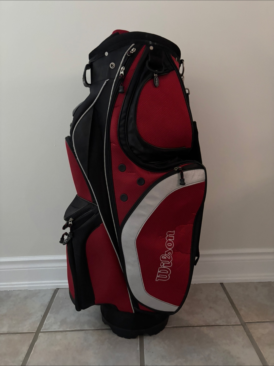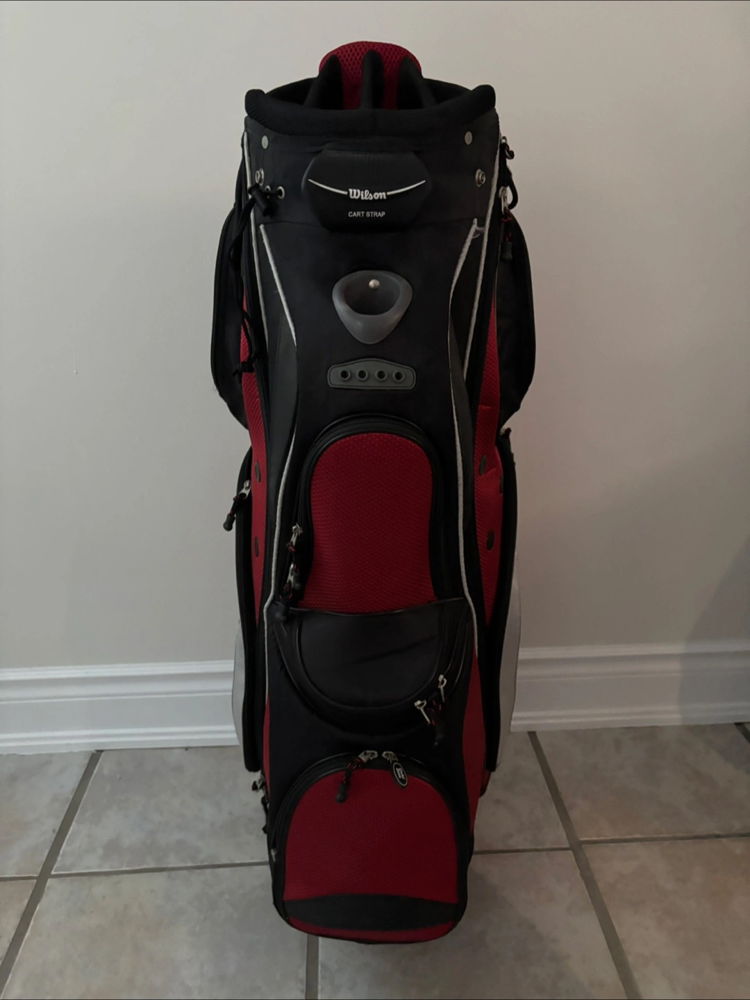 Selling a Wilson golf cart bag in red and black. It's in great condition and ready for the golf course!