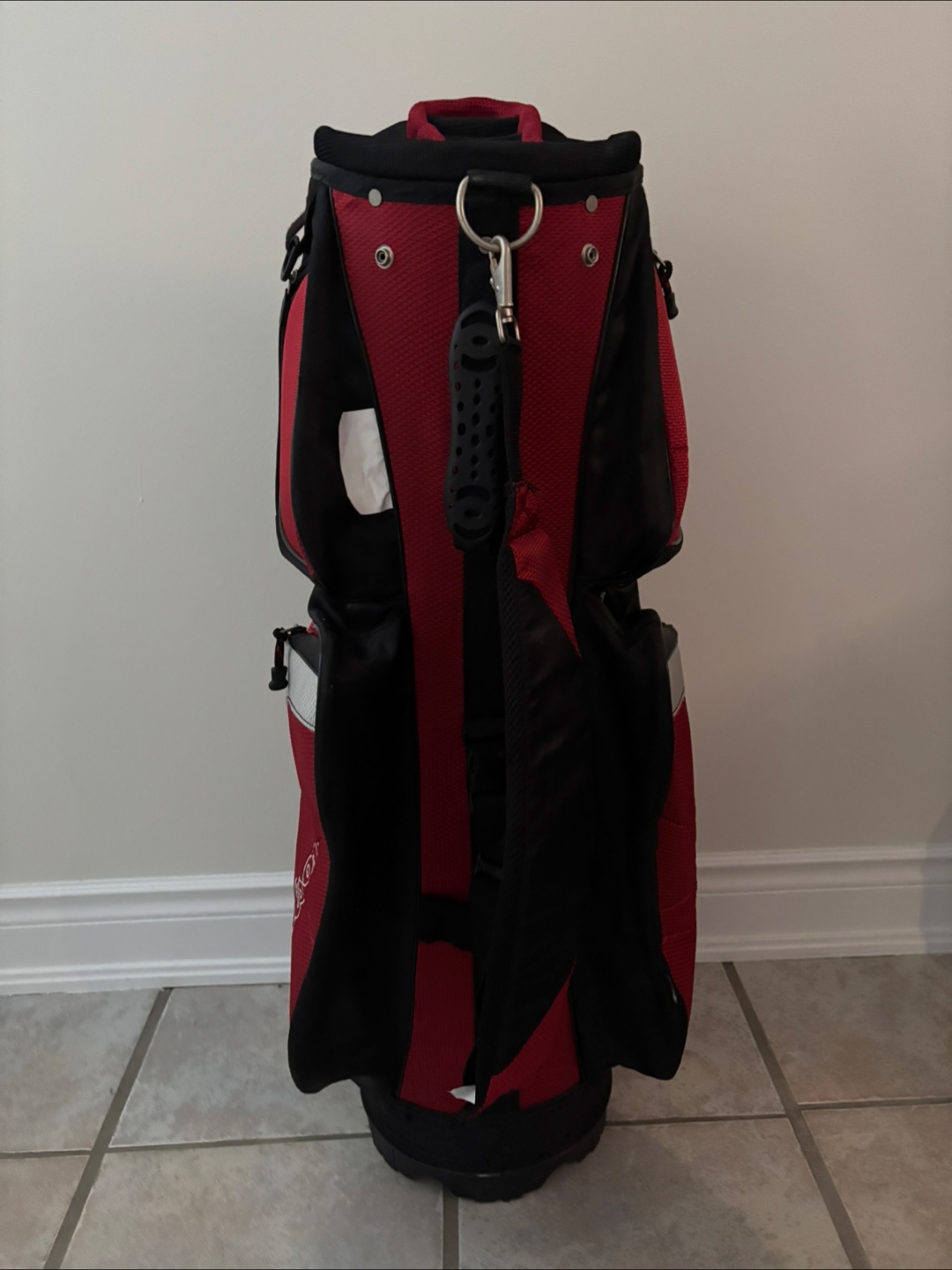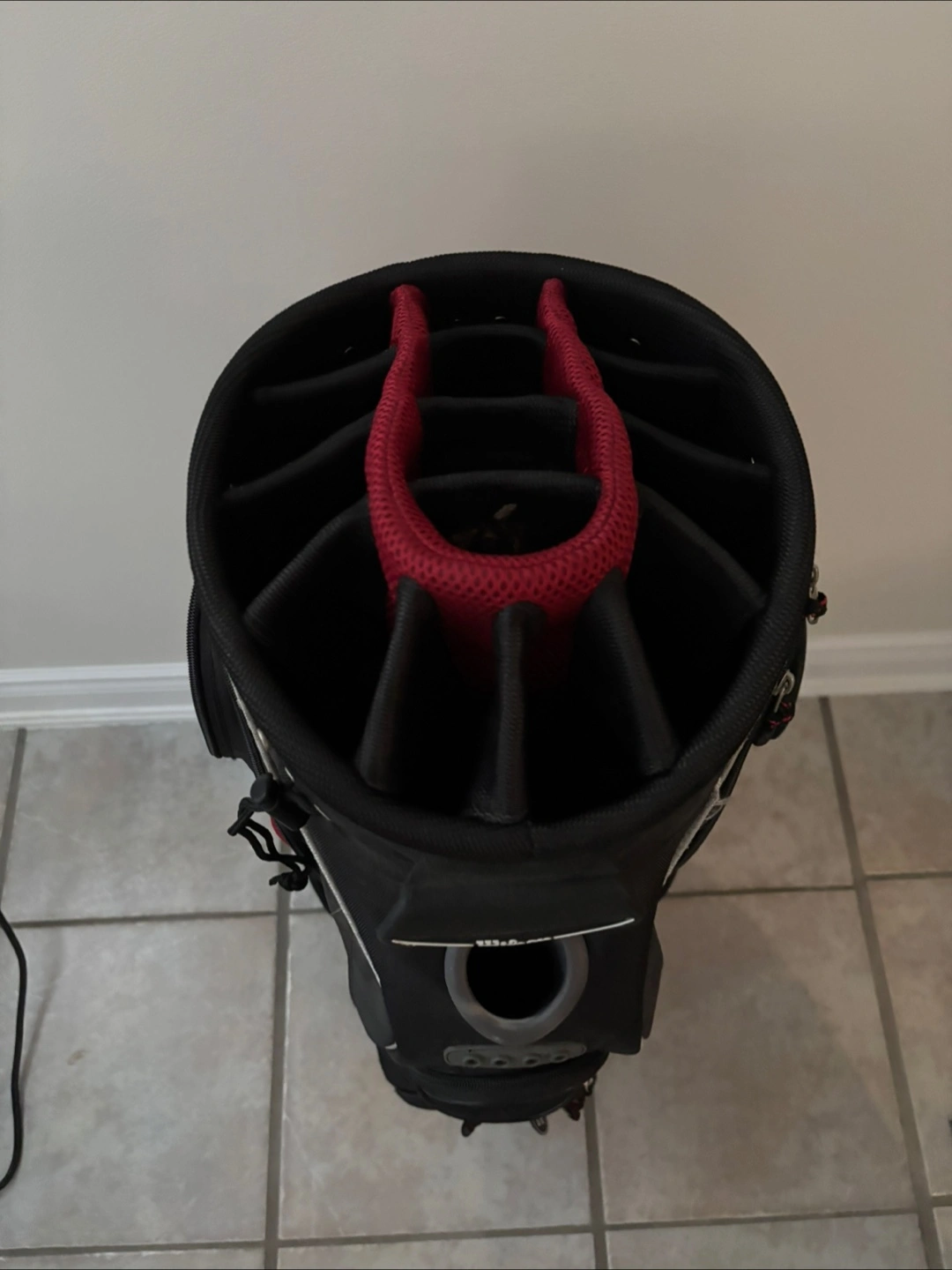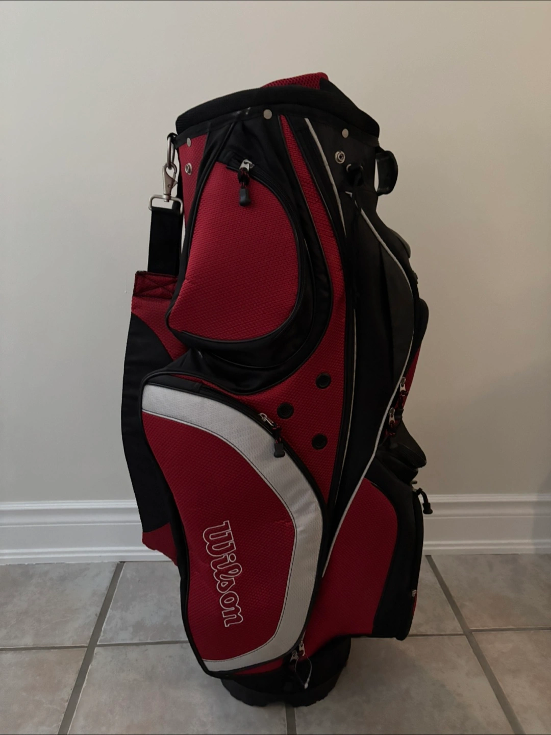 Selling a Wilson golf cart bag in red and black. It's in great condition and ready for the golf course!