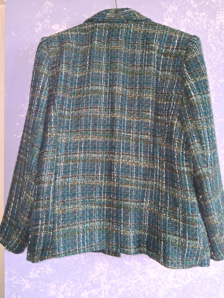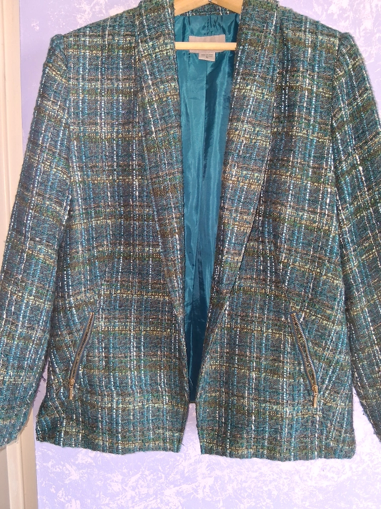 Selling a Tanjay tweed blazer in size 16. It's a lovely jacket with a unique texture and pattern. Perfect for adding a touch of sophistication to your wardrobe!
