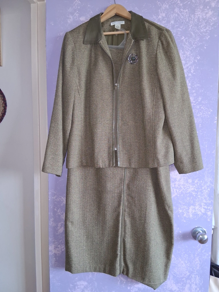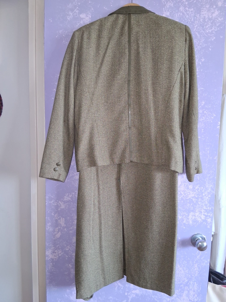 Here's a lovely Lucien Daunois skirt suit set! It's made of 100% wool and was made in Canada. Perfect for a professional or formal occasion. Needs a minor stiches for slit in skirt.