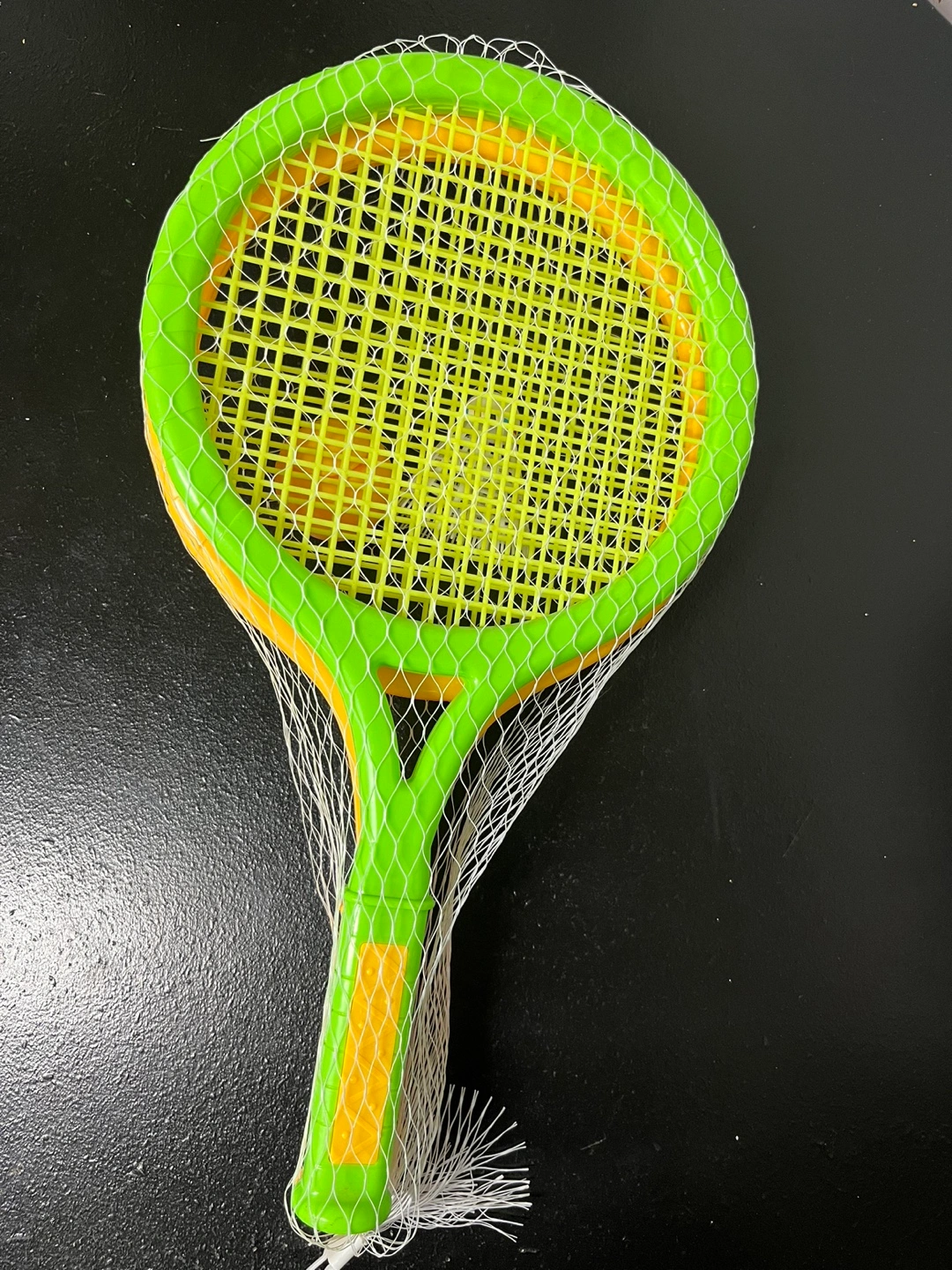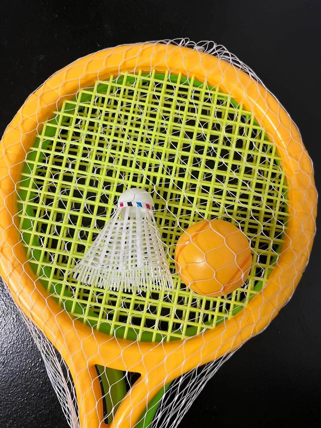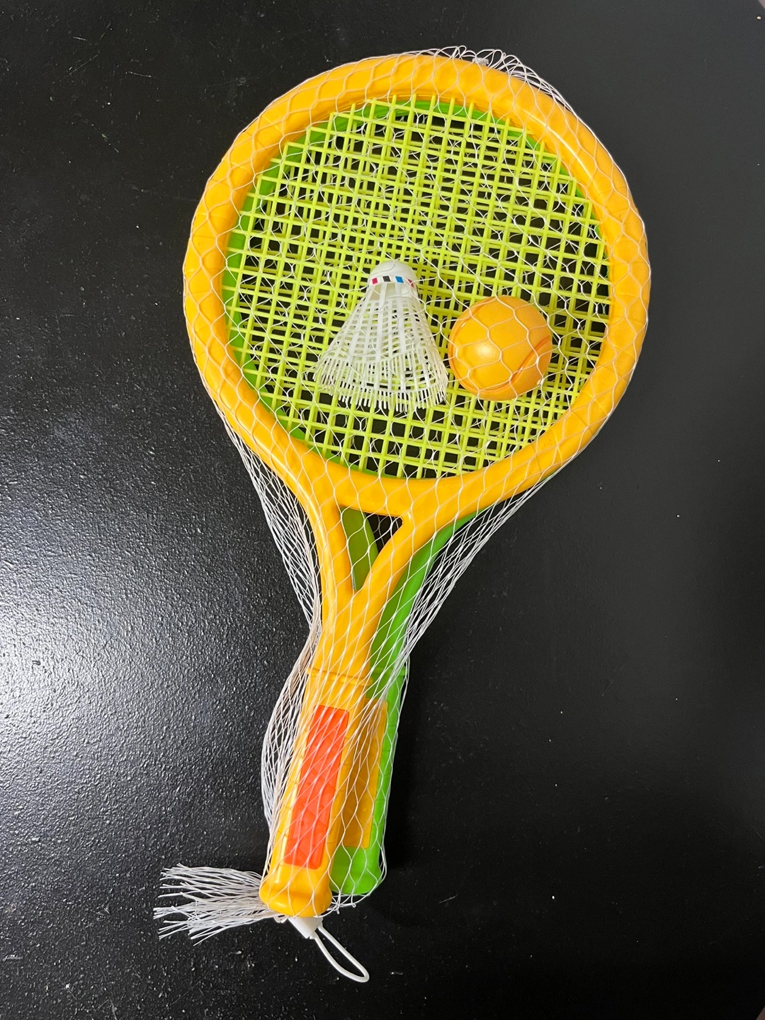 This is a fun toy tennis racket set for kids! It includes a yellow and green racket, a ball, and a shuttlecock. Perfect for some backyard fun!