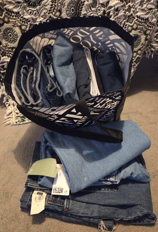 A bag full of jeans for sale! There are jeans from GAP and H&M. Variety of washes and styles included. Stretchy pants aswell, shorts & shirts.
