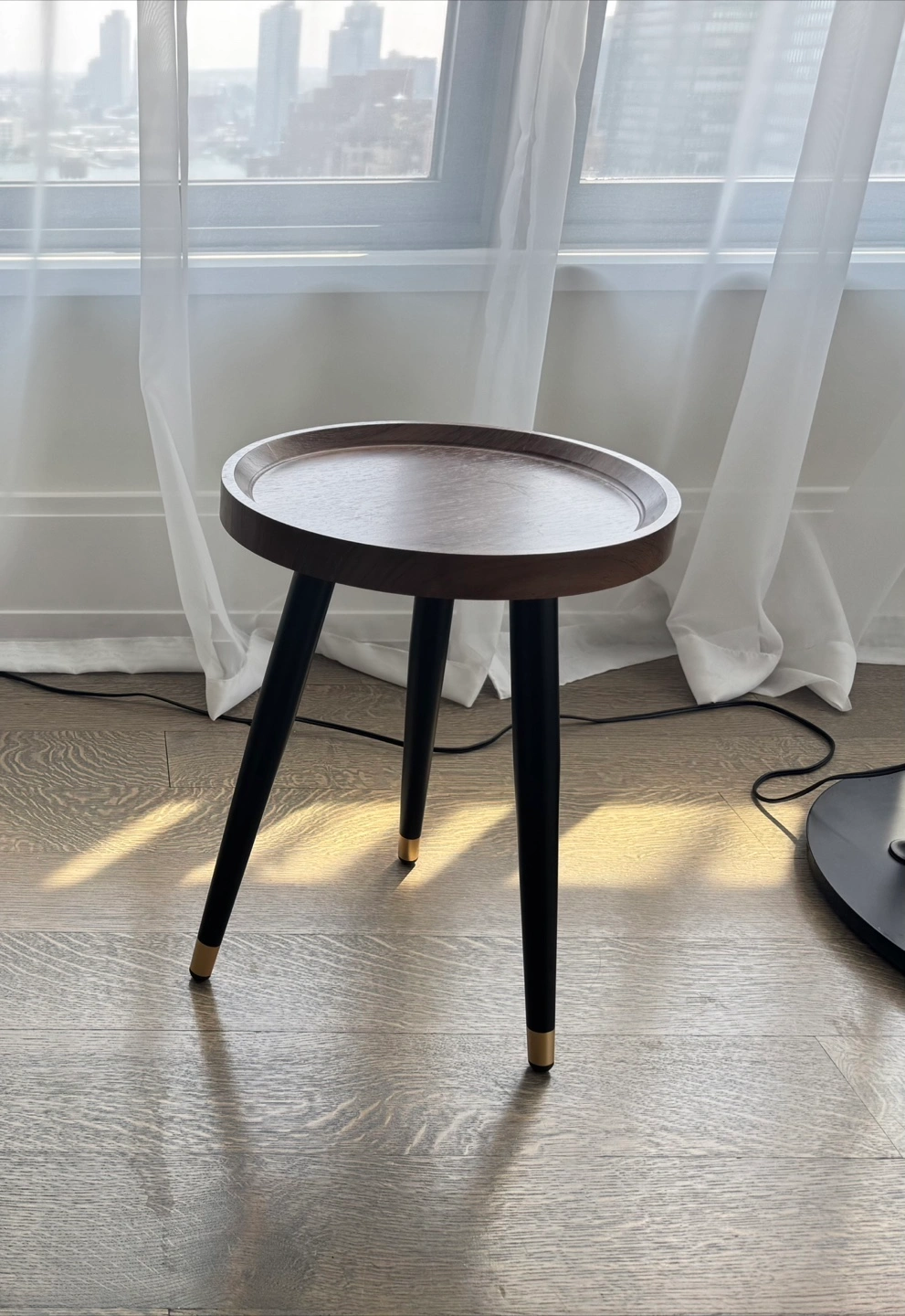 Two matching mid-century style round tables with a dark walnut tray-top and tapered black legs with brass caps. Sturdy and light—great as side tables, end tables, nightstands, plant stands, or small coffee tables. Very clean, minimal wear.