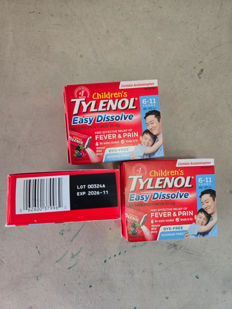 Selling Children's Tylenol Easy Dissolve Acetaminophen Powder 160 mg for kids aged 6-11 years (48-95 lbs). These are dye-free and sucrose-free with a natural wild berry flavour. Expiry is 2026 November