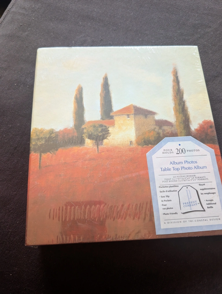 I'm selling a brand new Present Company Table Top Photo Album! It holds up to 200 photos. The album is designed to hold photos in 3 1/2" x 5" or 4" x 6" formats. It features easy-slip in pockets and accepts additional refills. 8.75" by 8"