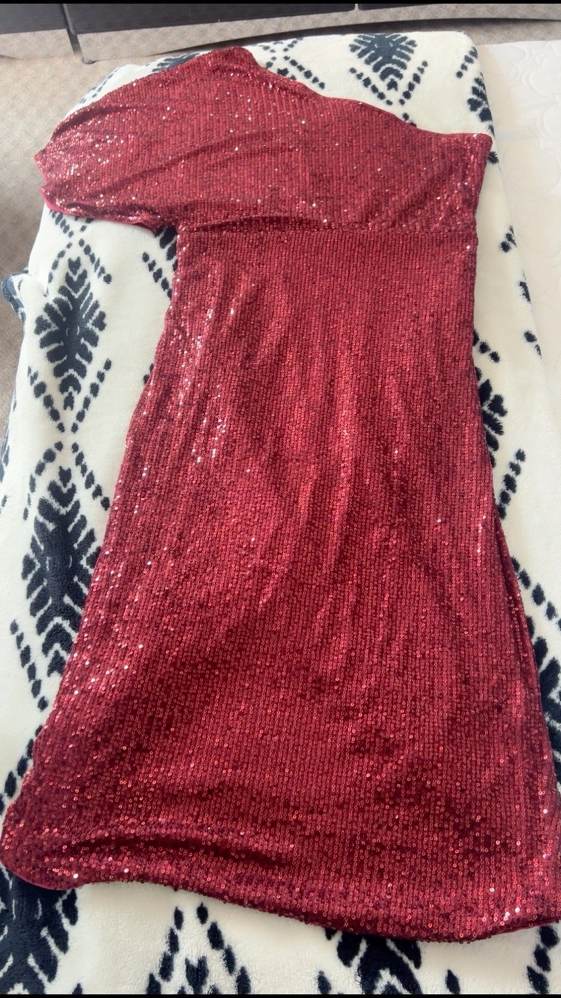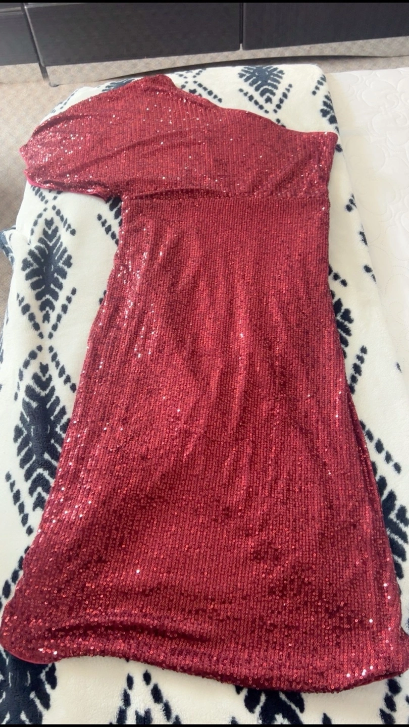 This is a beautiful red sequin dress with a one-shoulder design. It's perfect for a night out or a special occasion. The dress is in great condition and ready for a new home!