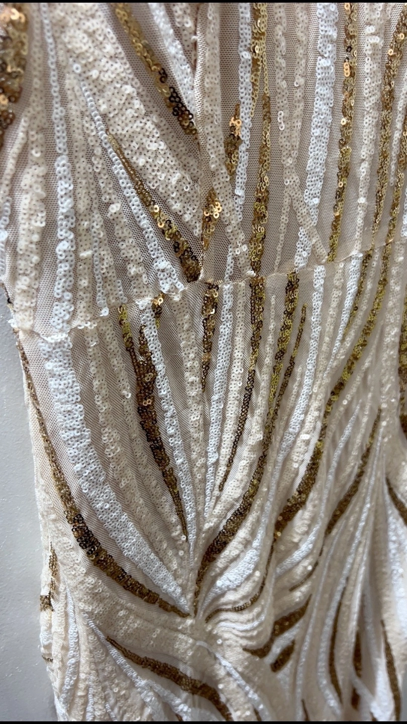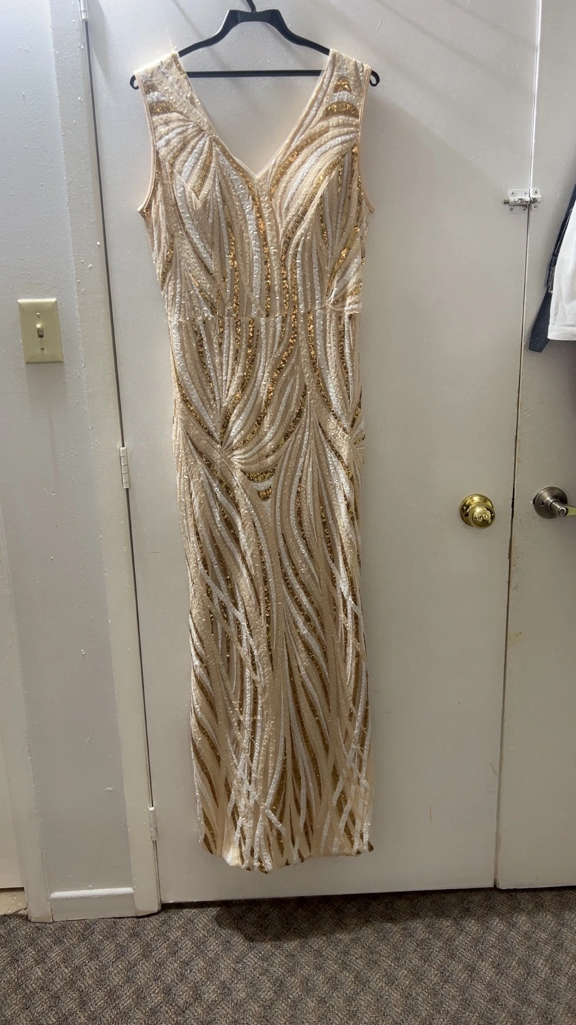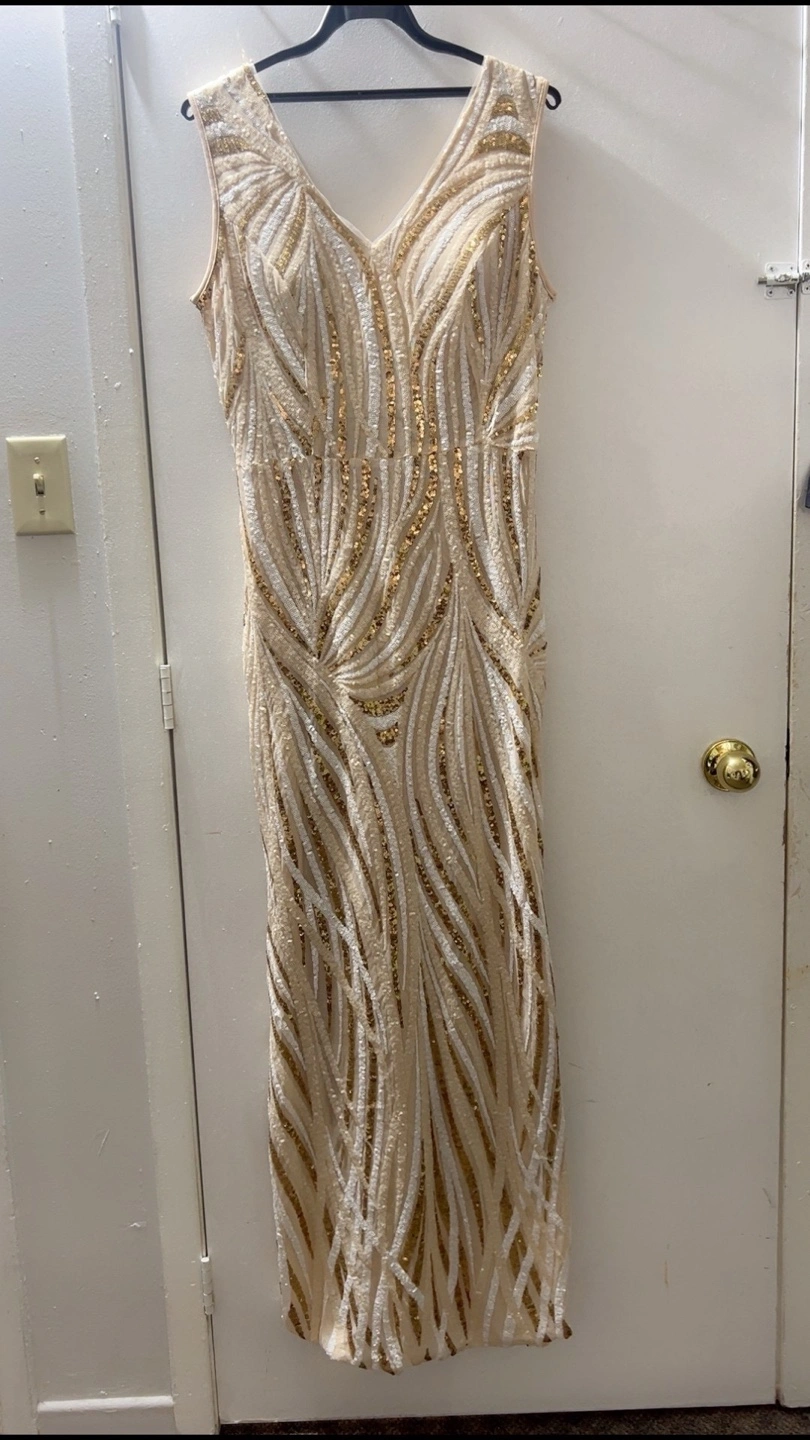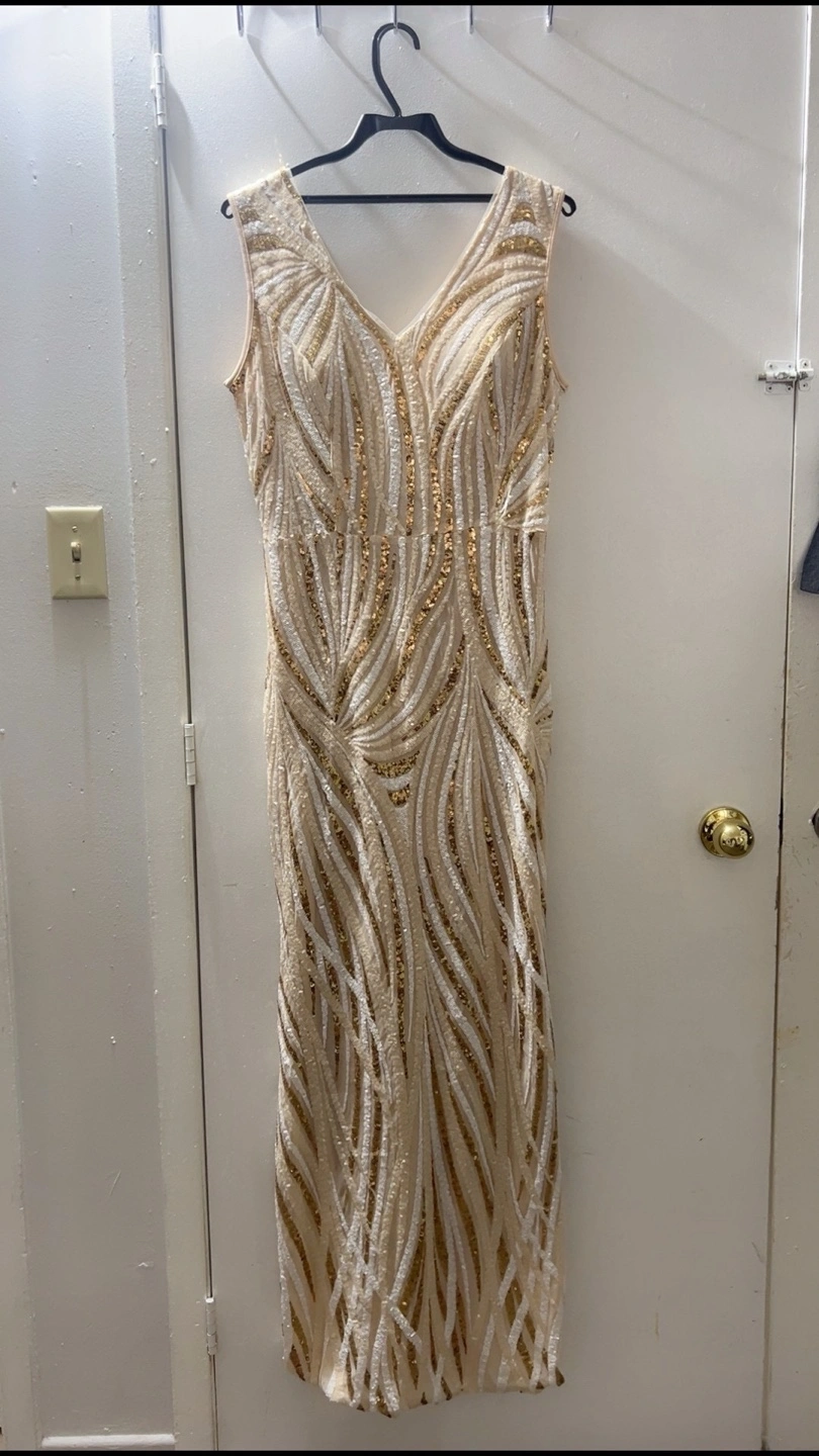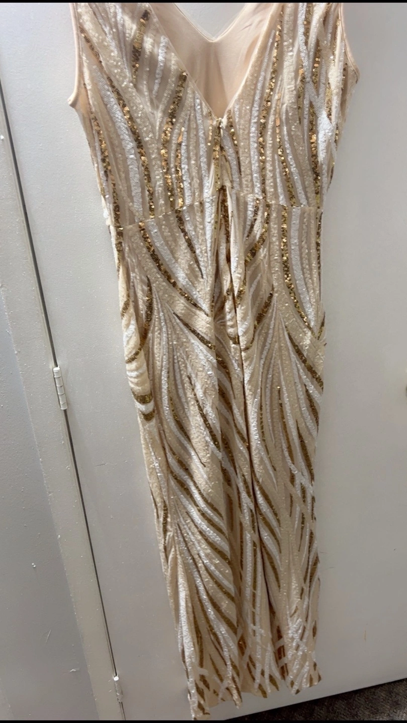 This is a beautiful sleeveless formal dress with a sequin design. It's perfect for a special occasion or a night out. The dress has a flattering silhouette and is sure to turn heads. It is in great condition and ready for a new home!