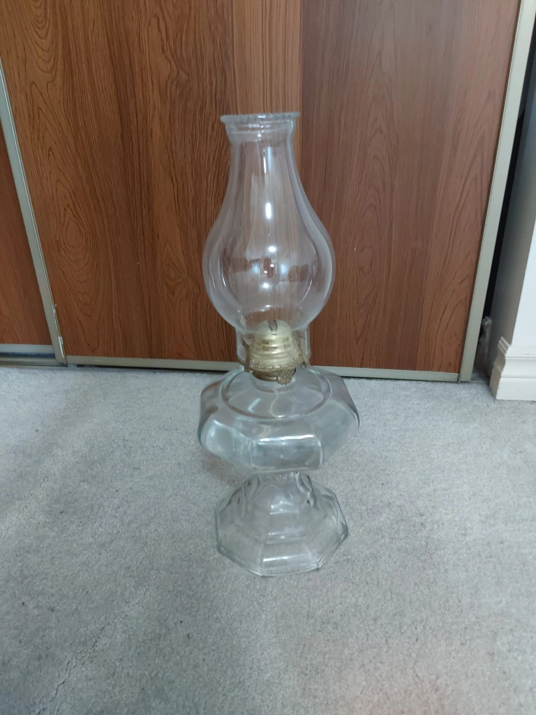 Selling a vintage clear glass oil lamp. It's in good condition and would make a lovely addition to any room. The lamp has a classic design and is perfect for creating a warm and inviting atmosphere. It's a beautiful piece and ready to light up your home!