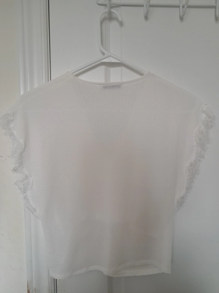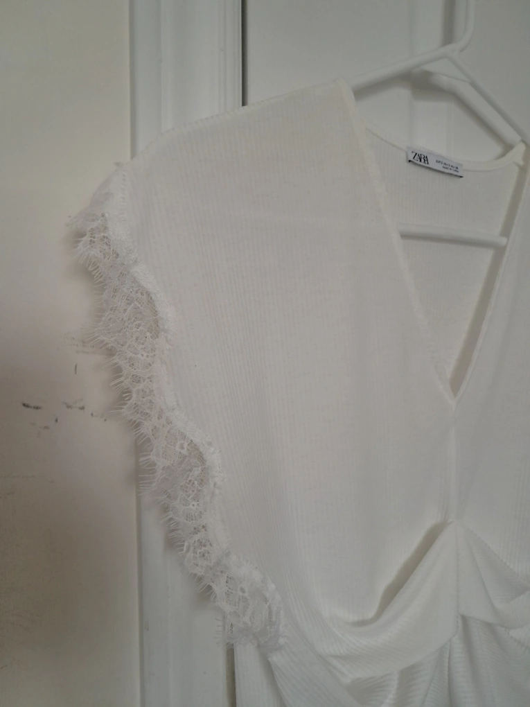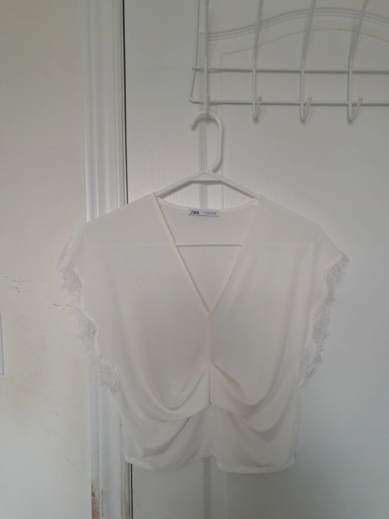 Here's a cute Zara top in a size small. It's white with lace trim on the sleeves. Perfect for a hot summer day out!