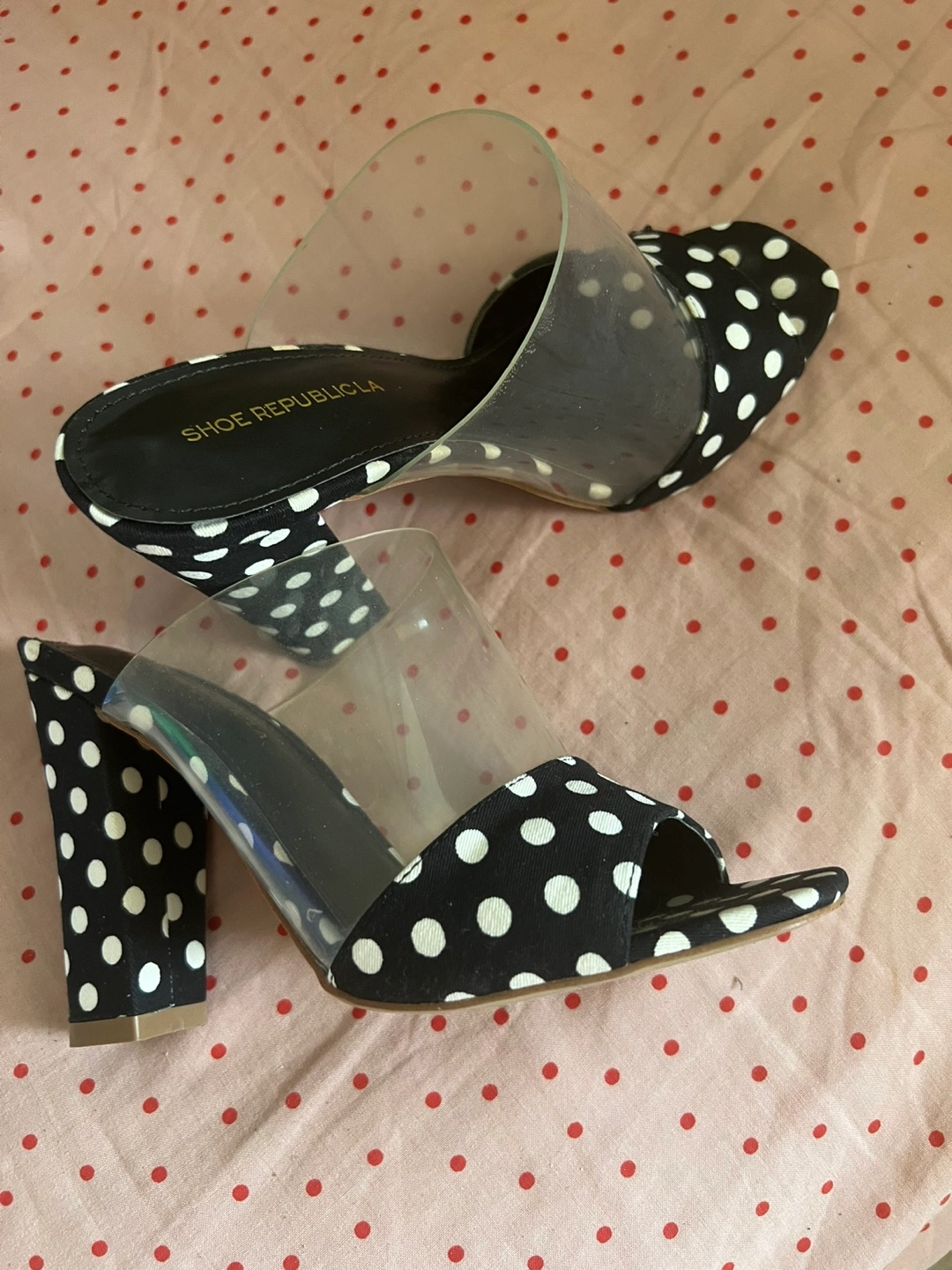 Cute Shoe Republic LA heels with a fun polka dot pattern! They have a clear strap and a block heel, perfect for dressing up any outfit