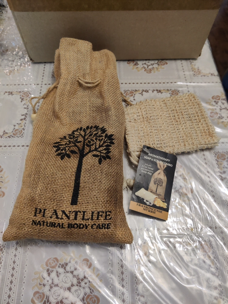 Plantlife Aromatherapy Soap & Scrub Combo. Includes 12 oz soap plus exfoliating soap bag. Frankincense & Myrrh