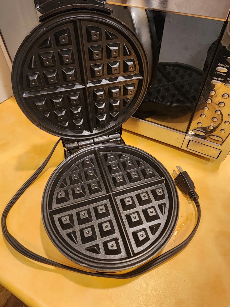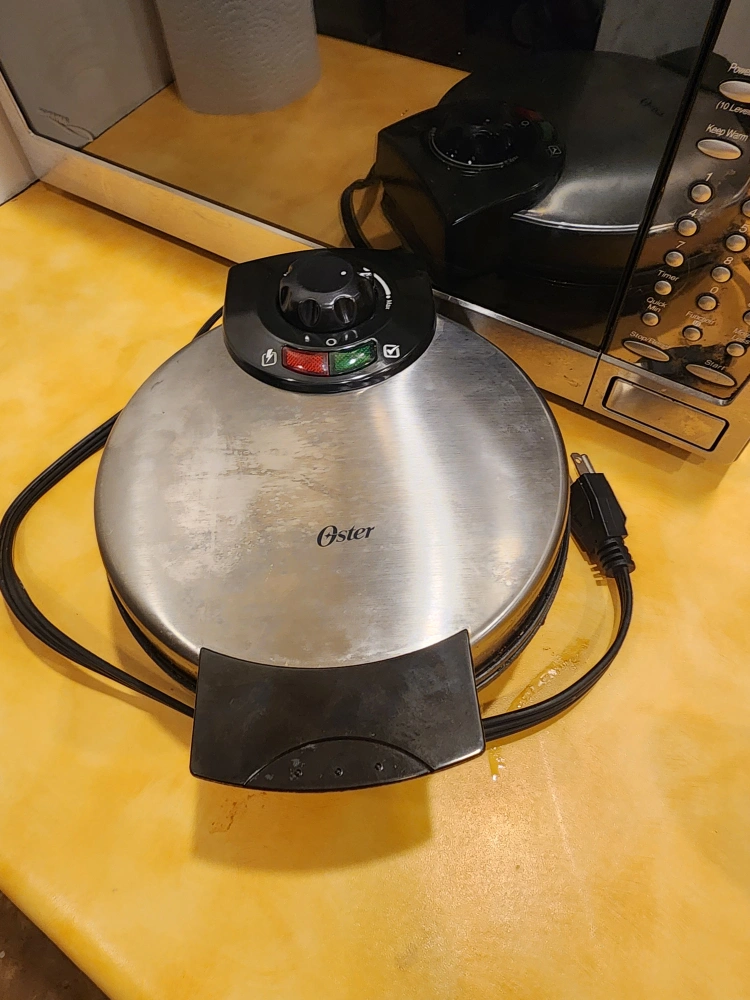 Selling a used Oster round waffle maker. It's in good working condition and ready to make some delicious waffles! It heats up quickly and is easy to use. Perfect for weekend breakfasts or a fun treat any day of the week
