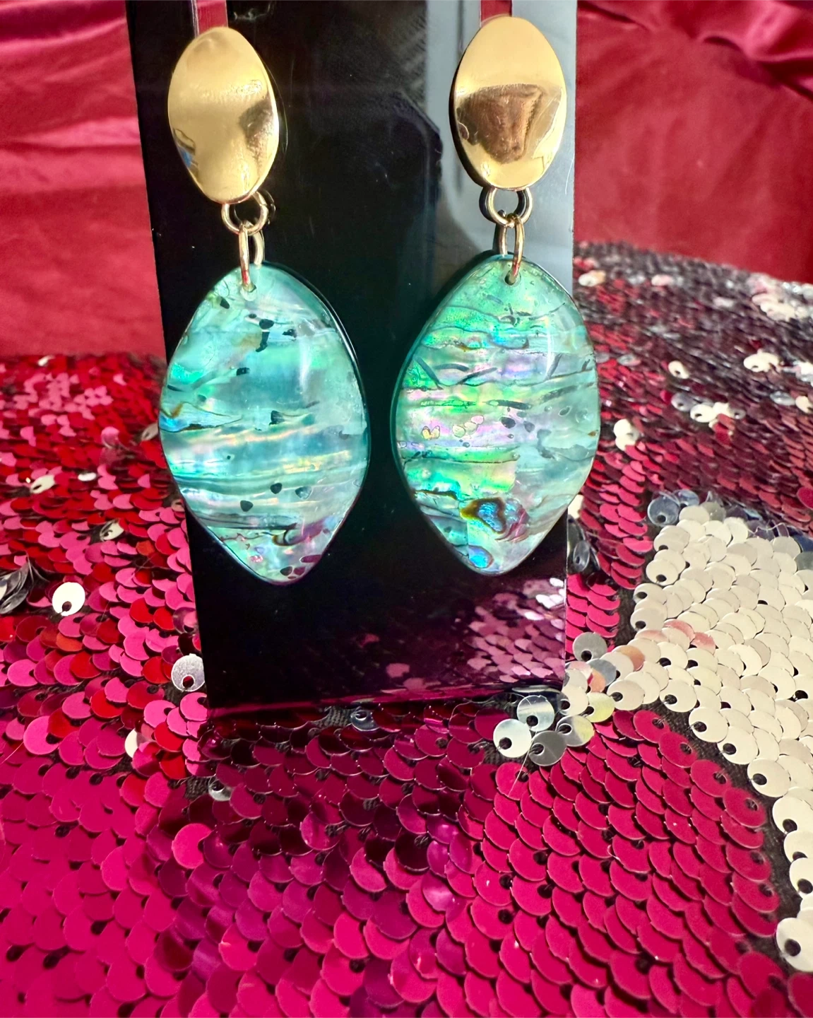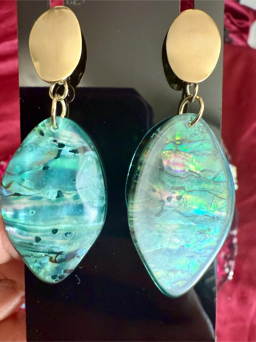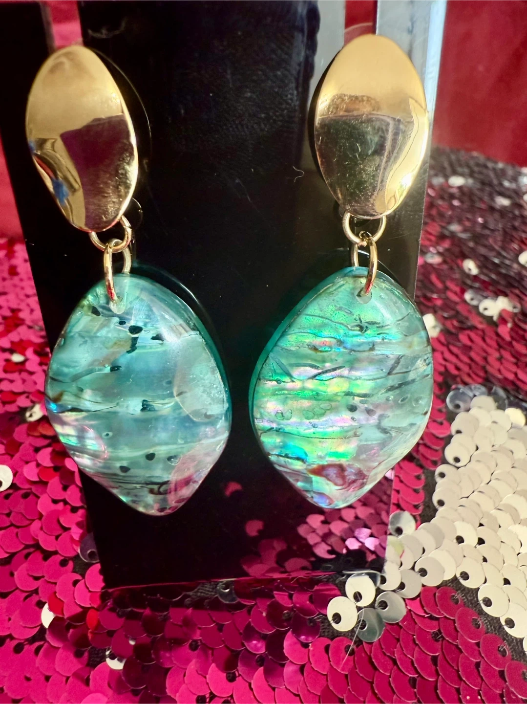 101These are a beautiful pair of dangle earrings with a gold stud and a teal, iridescent drop. They're perfect for adding a pop of colour to any outfit!