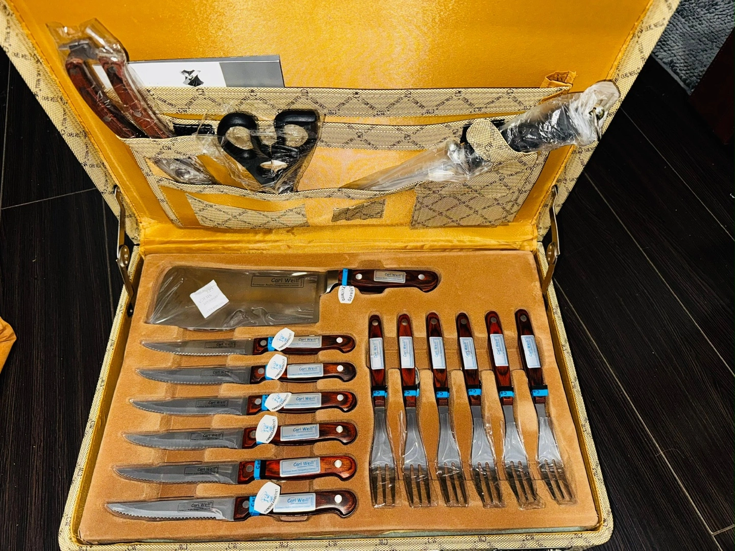 Selling a Carl Weill 24-piece knife set, complete with a carrying case! This set appears to be in excellent condition and includes a variety of knives, forks, and other utensils. It's a comprehensive set for any kitchen. The original packaging shows a price of Euro 625, which is about $945 Canadian. Price can be negotiate . Please DM me or Contact details below :- Gmail : kapoorneeraj1970@gmail.com. (437) 992-2700 (416) 857-2700