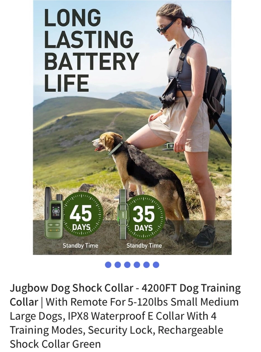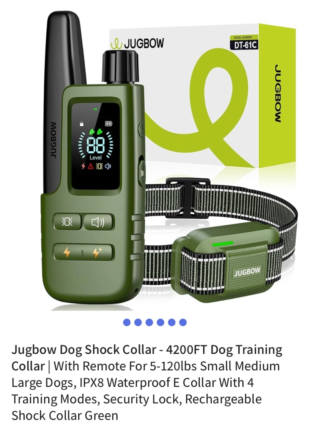 Looking to train your furry friend? I have a Jugbow dog training collar available. It's green and suitable for small to medium-sized dogs, from 5-120lbs. It has a remote with a range of up to 4200ft, so your dog can roam freely while training. The collar is also waterproof, so no worries about the rain! Originally bought for $127