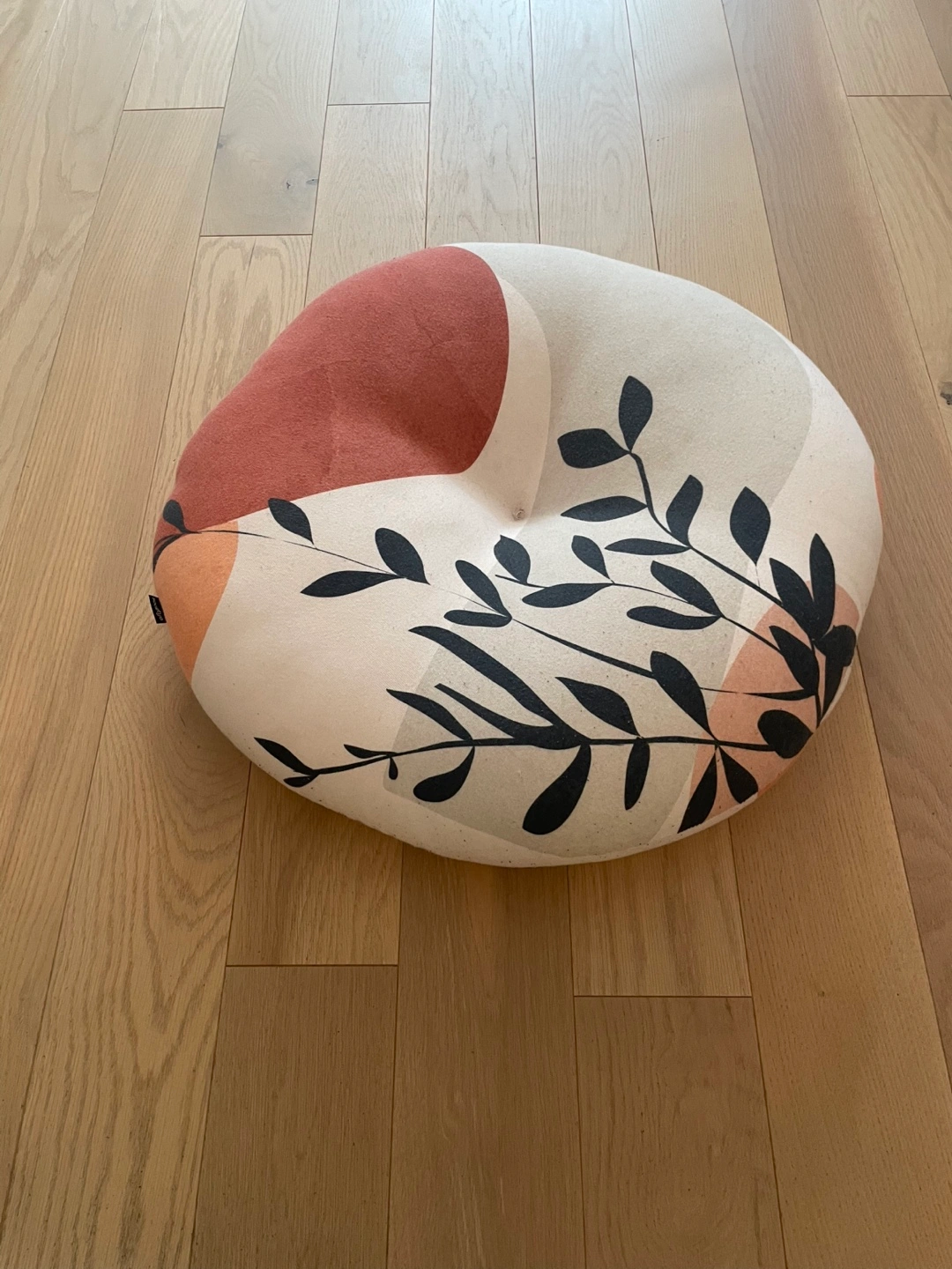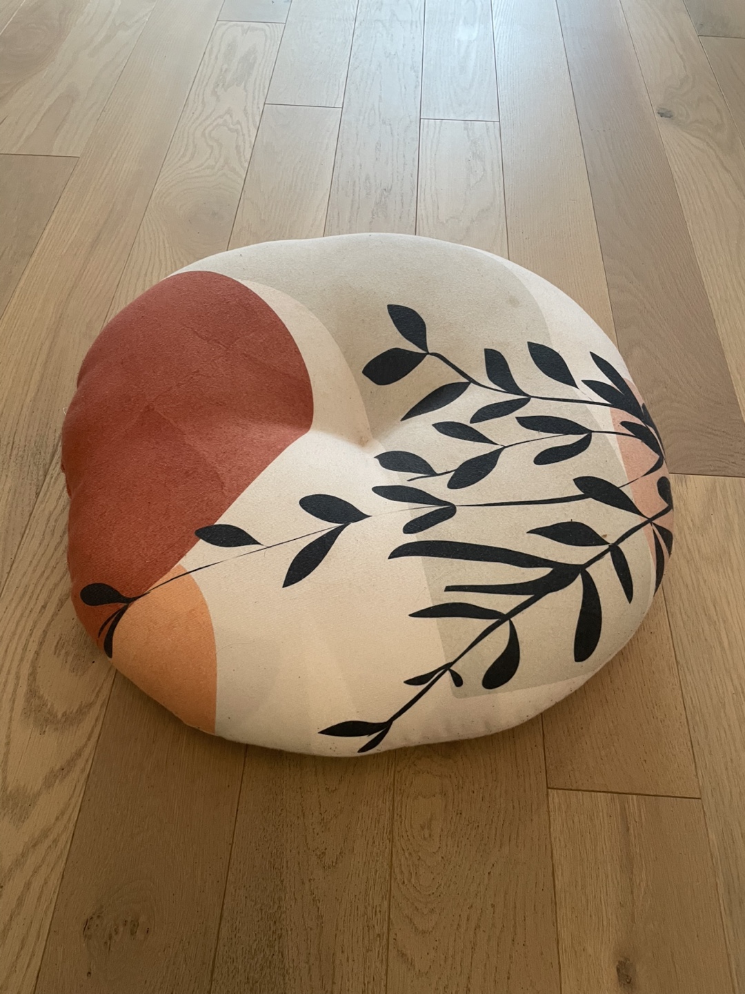 This large round floor cushion features a contemporary floral design in neutral tones with accents of rust, green, and orange. It's perfect for adding a touch of style and comfort to any room. Using as a floor rest, meditation cushion, pet rest or more. 26x26”