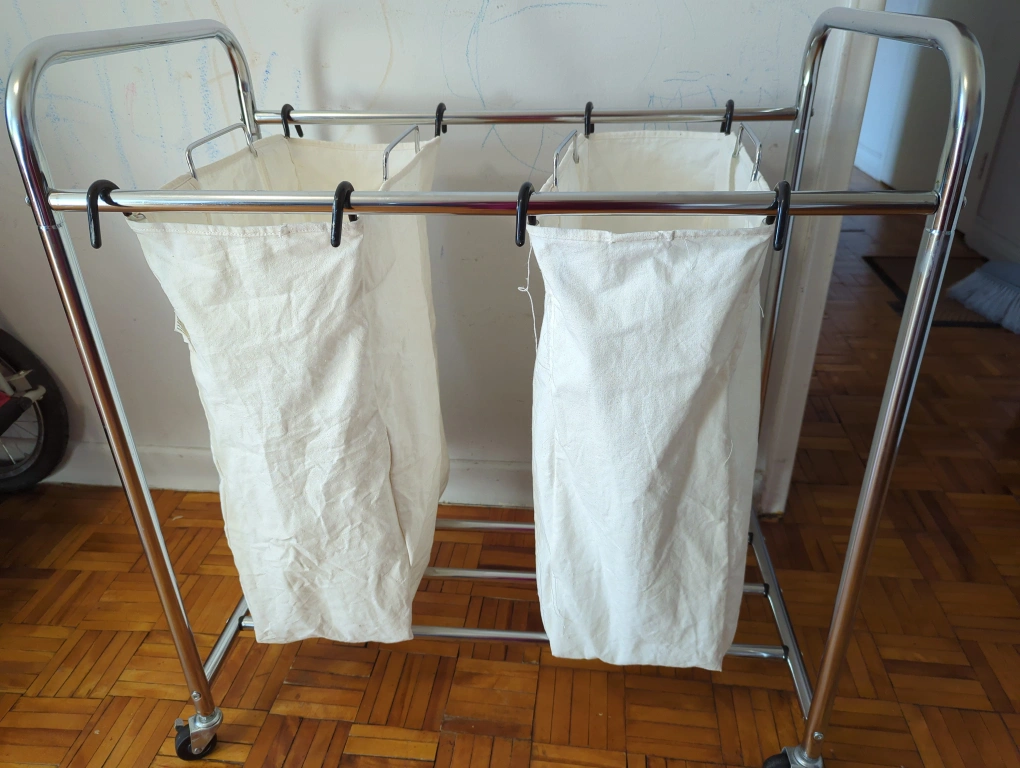 Laundry sorter with two bags for easy organization! Great for separating lights and darks or different family members' clothes. It's on wheels, so it's easy to move around your laundry room or closet. The bags are removable for easy emptying into the washing machine