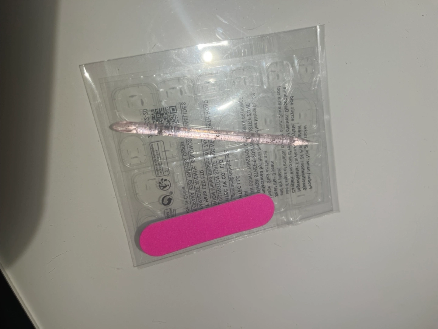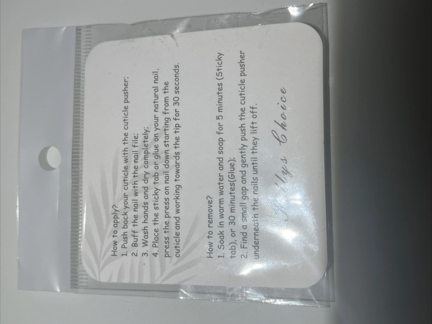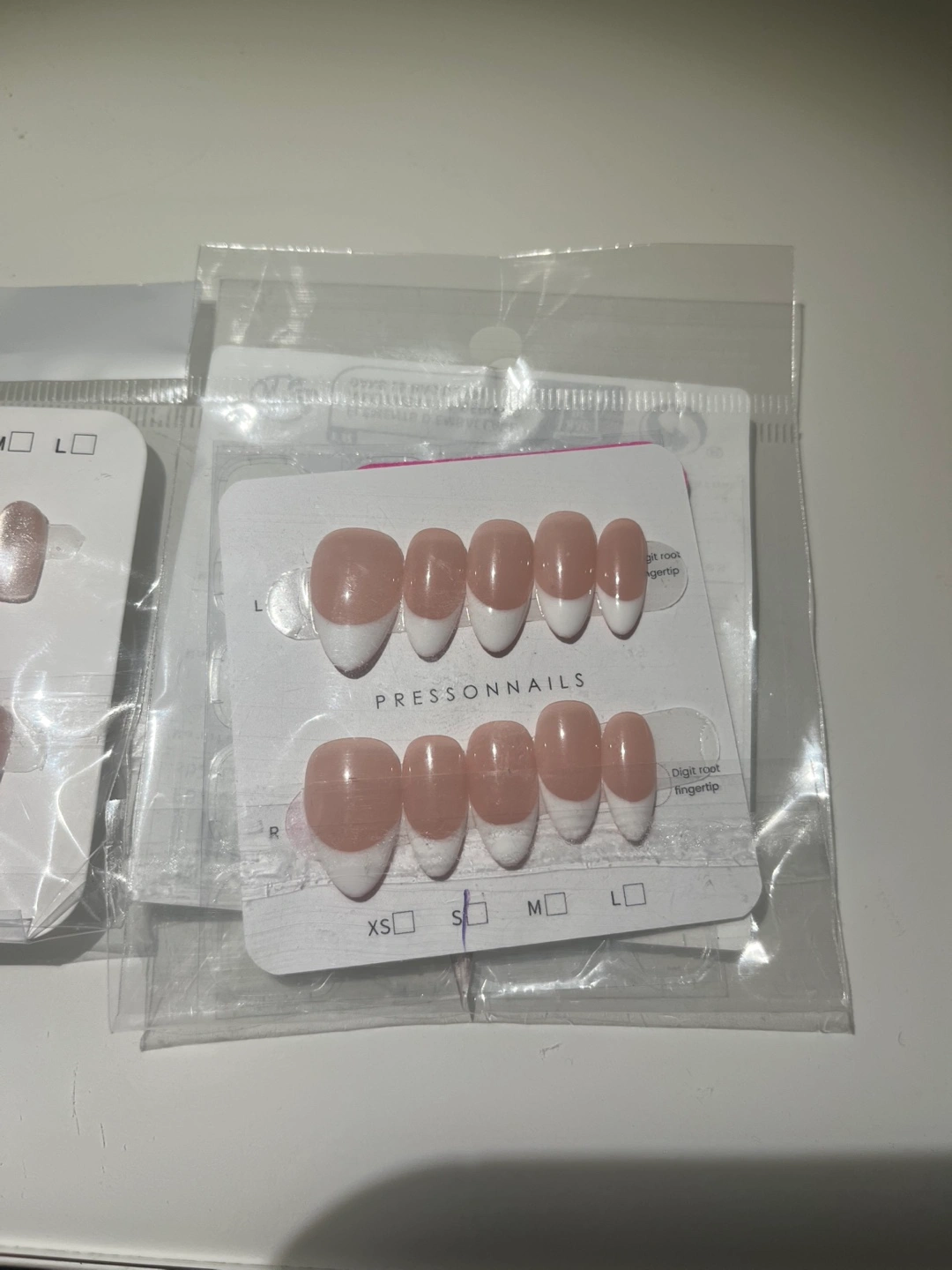New set of press on nails with a classic French tip design. Size small. Includes the nails, glue tabs, cuticle pusher and nail file. Perfect for a quick and easy manicure at home! SHEIN brand