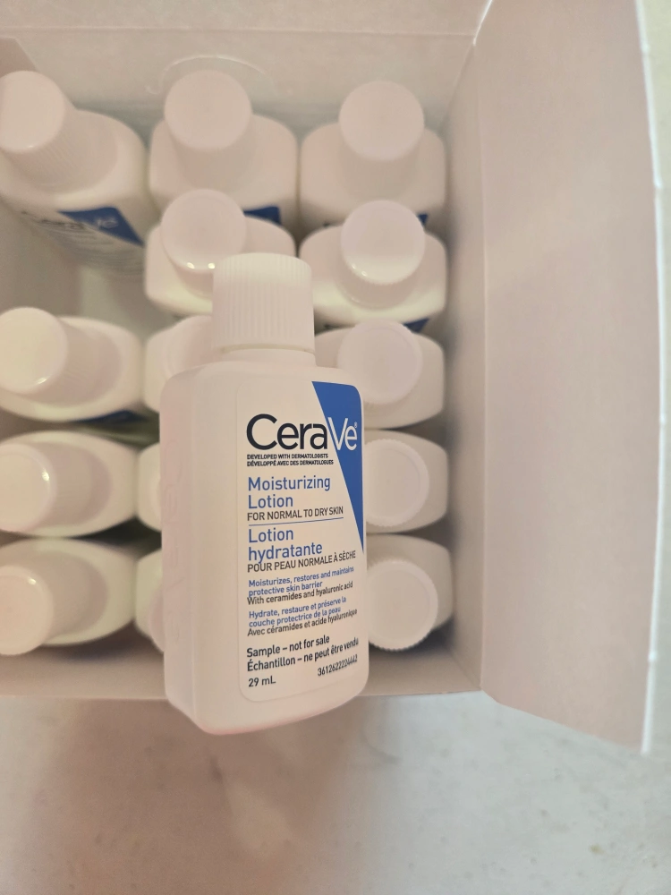Selling a box of CeraVe Moisturizing Lotion samples! The box contains 15 individual bottles, each with 29 mL of lotion. Perfect for normal to dry skin. The box is included