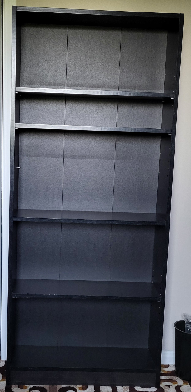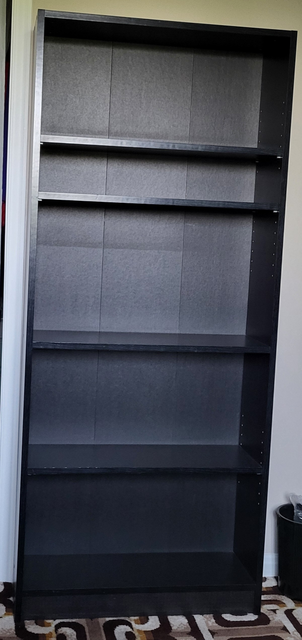 There are 5 shelves and 3 are adjustable. Measures: 69" high x 29 1/2" wide x 9 1/2" deep. Like new condition.