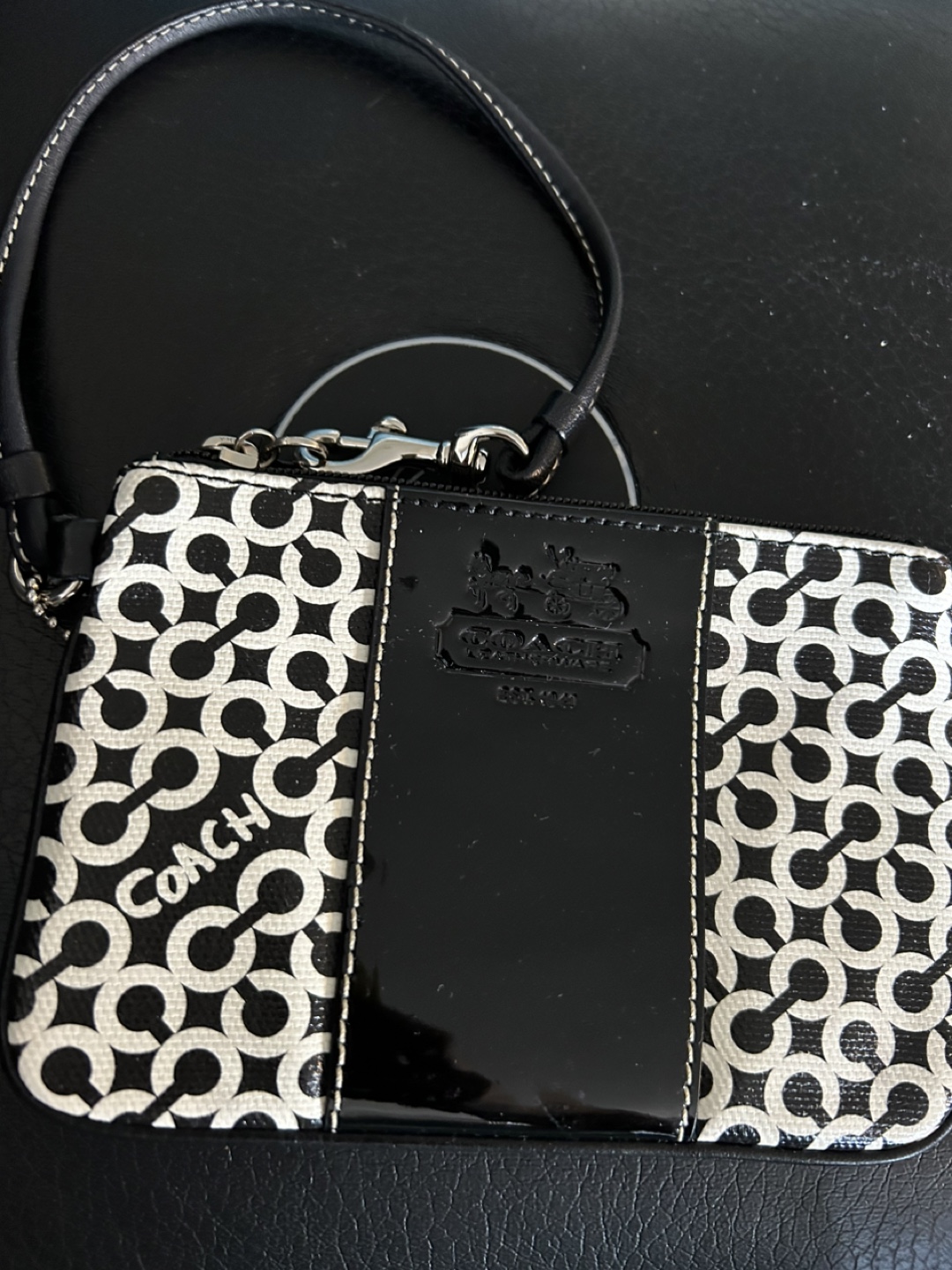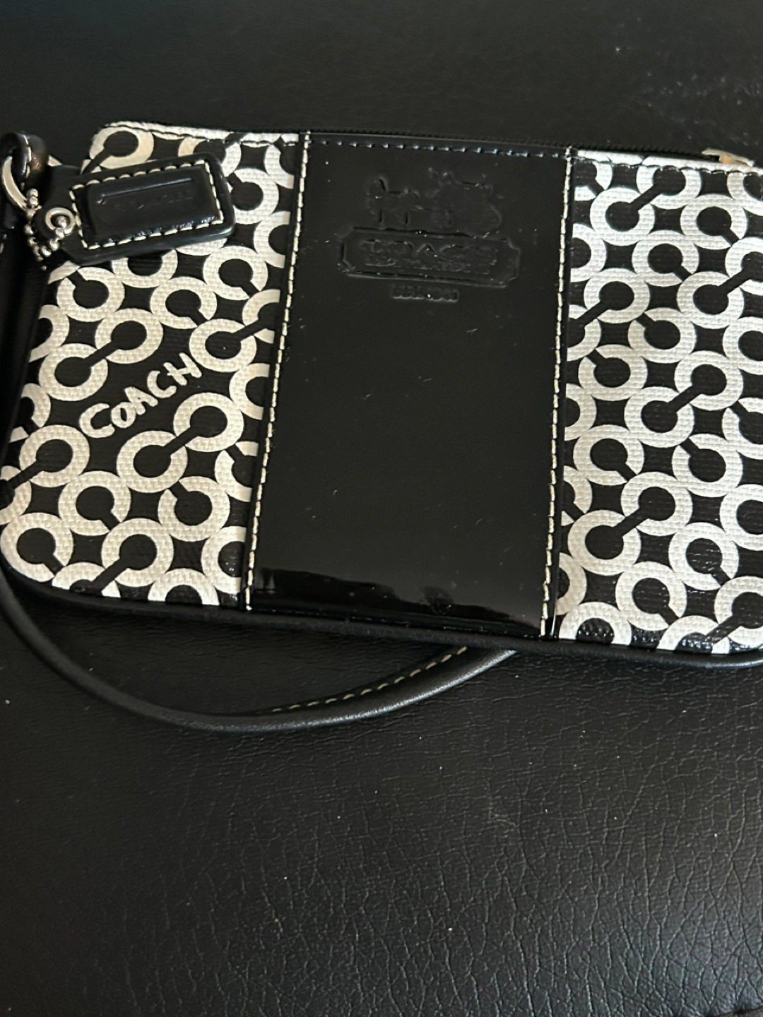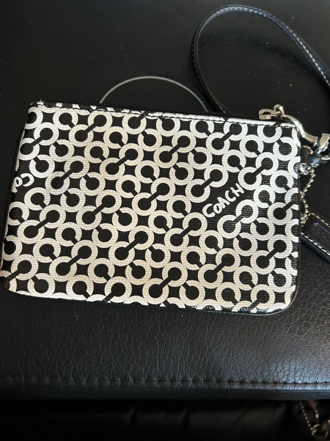 Selling a Coach wristlet in a black and white pattern! It's in great condition and perfect for carrying your essentials. The wrist strap is also in excellent shape. A stylish and practical accessory!