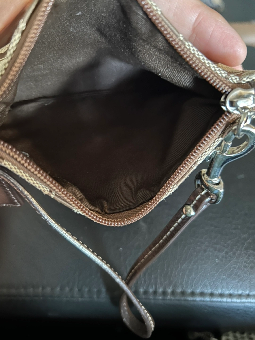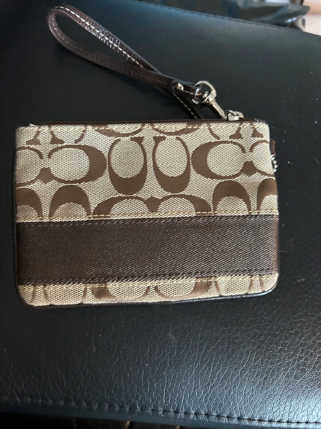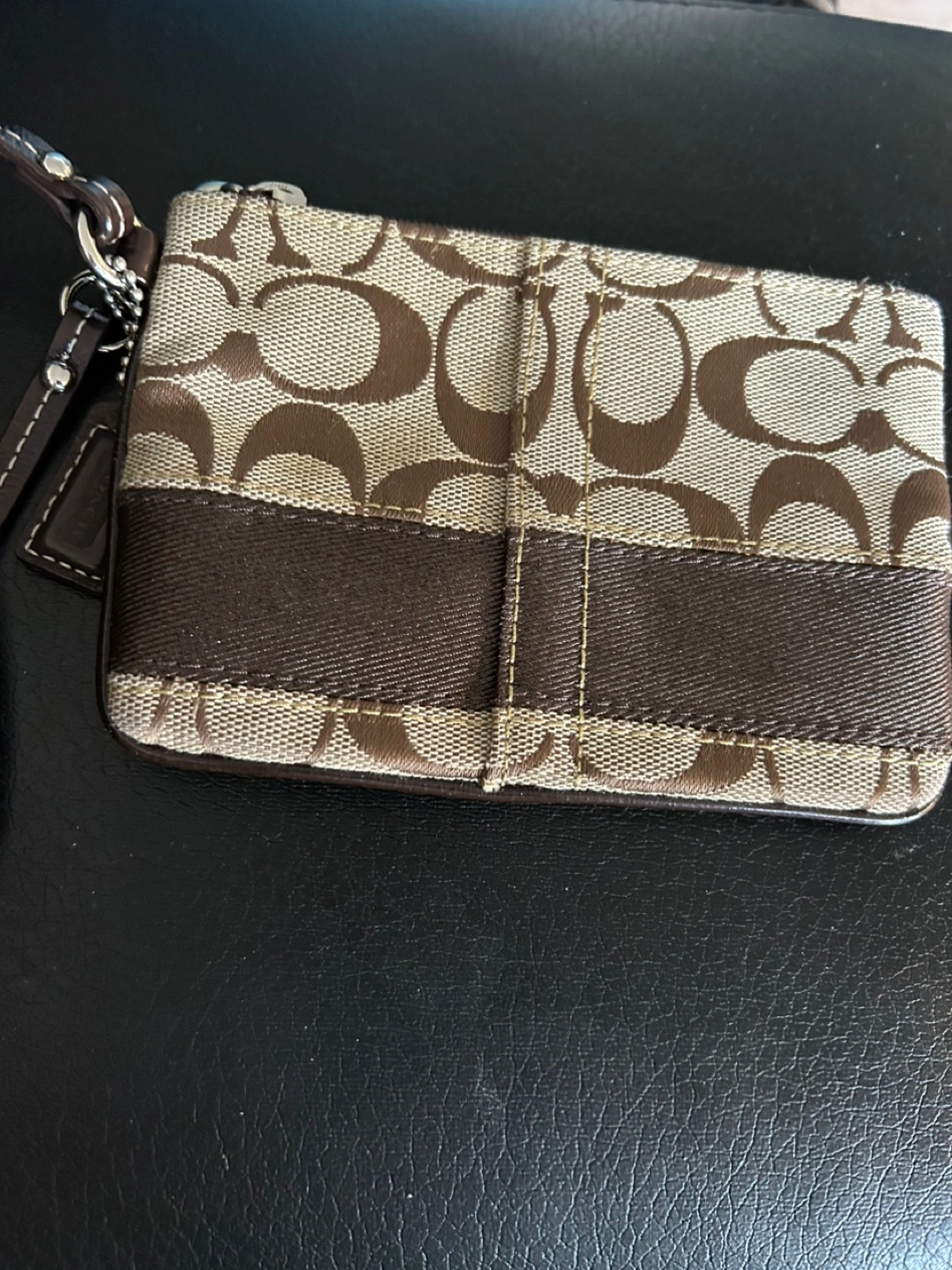Selling a cute Coach wristlet! It's in great condition and perfect for carrying your essentials. The wristlet has a brown and beige pattern with a brown strap.