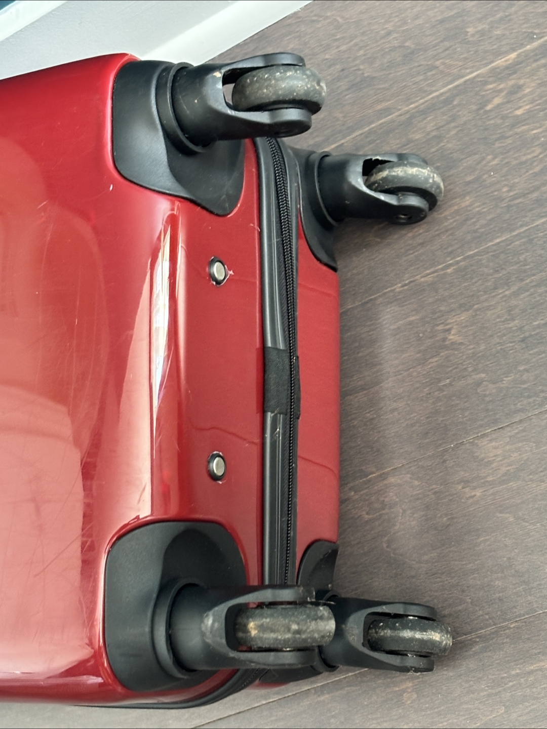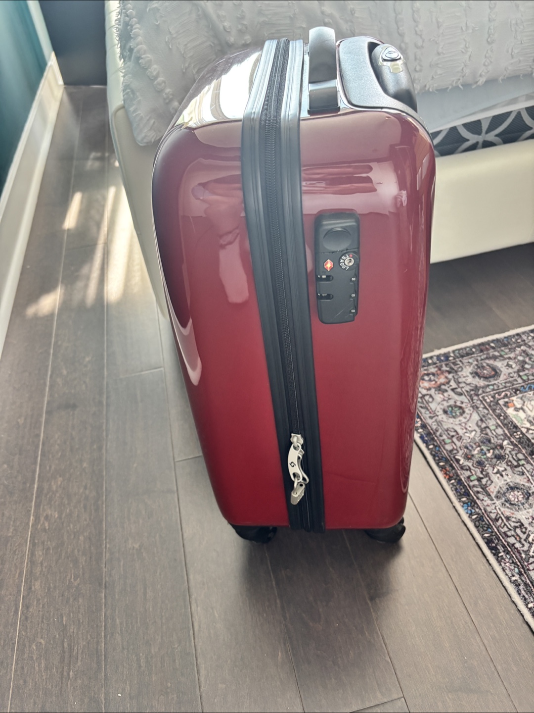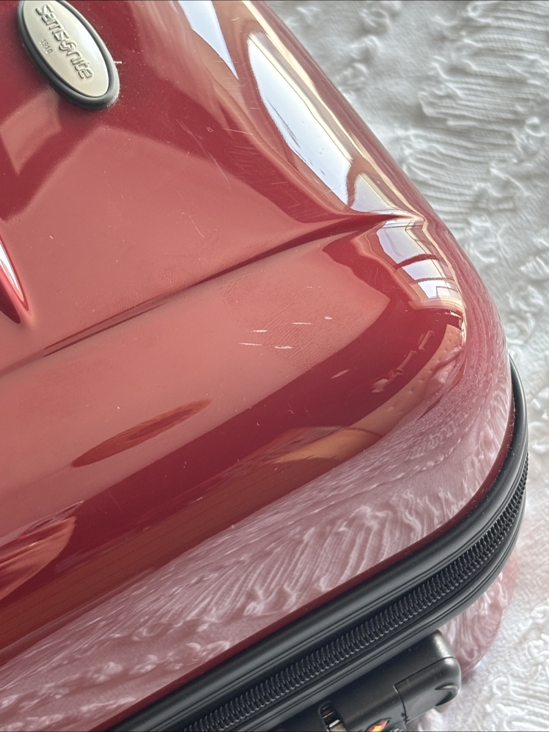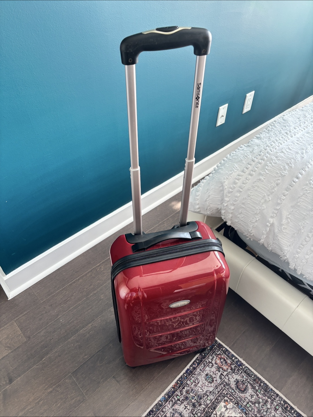 Selling a Samsonite carry-on suitcase in burgundy. It's in good condition and ready for your next trip! Perfect for fitting in overhead bins and easy to maneuver through the airport