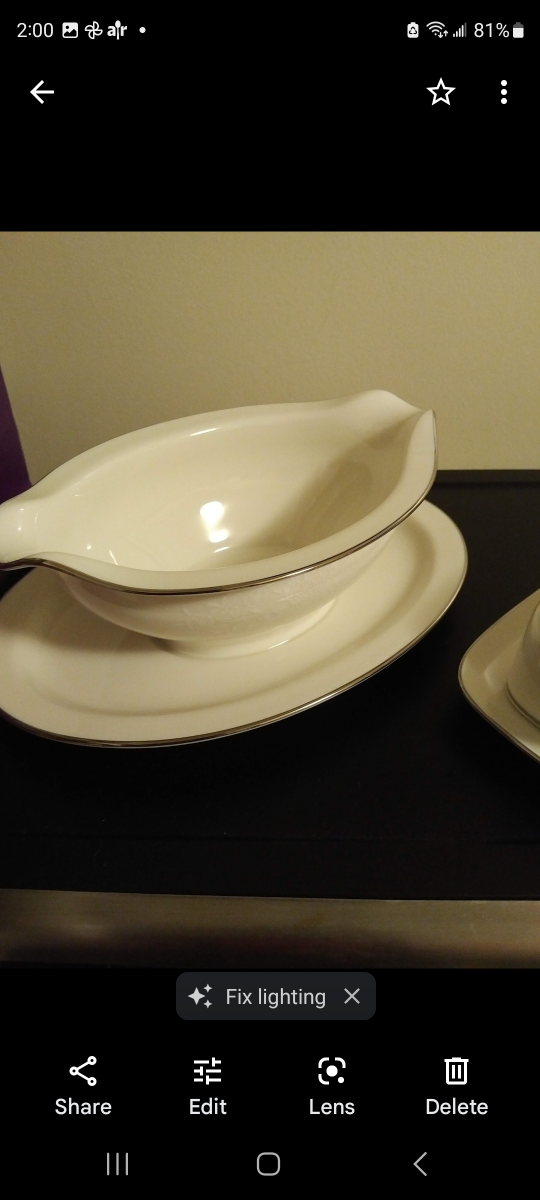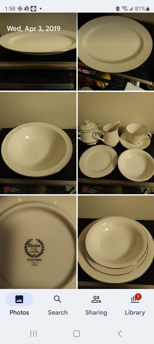 Selling a beautiful Carico China Precious Memories set. It's in pristine condition and perfect for adding a touch of elegance to your dining experience. The set includes various pieces, as shown in the photos. 12 place settings plus serving dishes ++. It's a white on white Damaske pattern and is platinum rimmed.