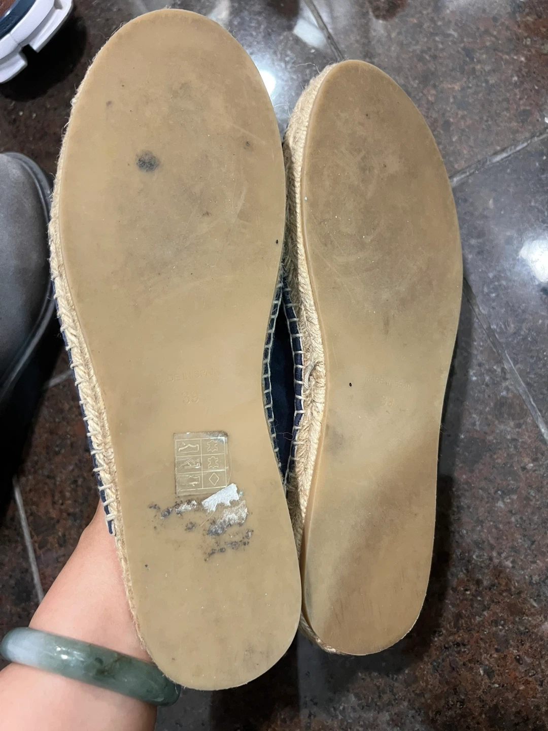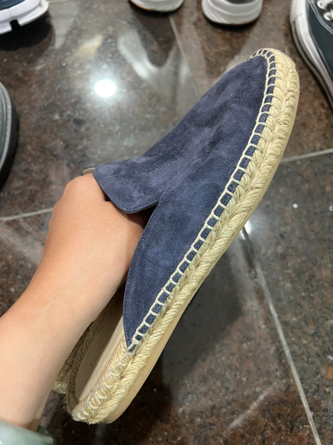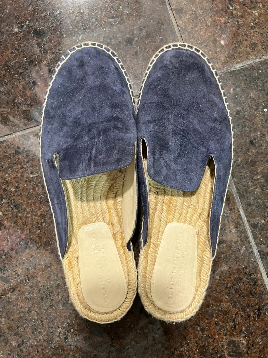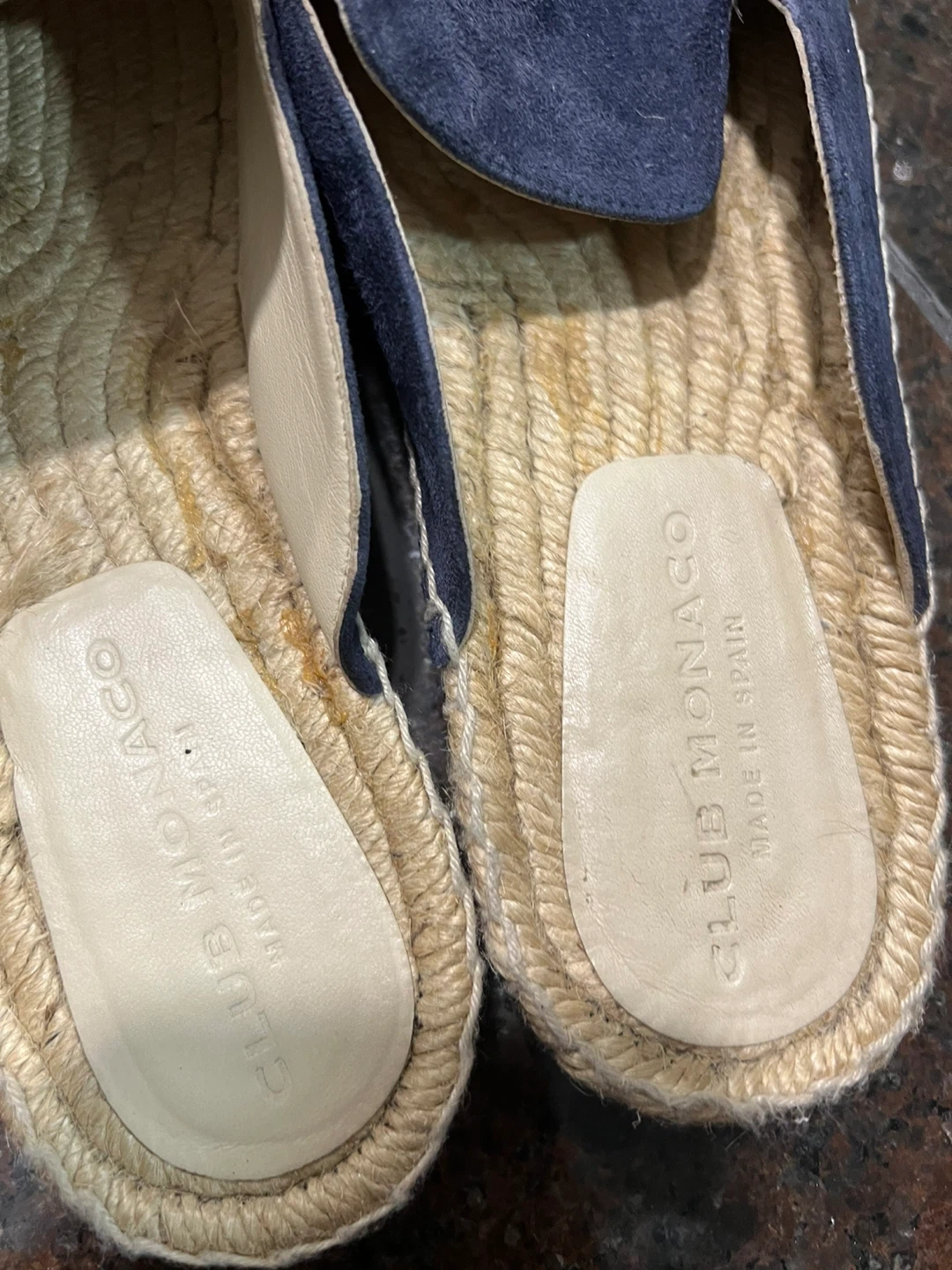 Selling a pair of Club Monaco espadrille mules. They're a size 39 and feature a stylish navy blue suede upper with a classic espadrille sole. These were made in Spain and are perfect for adding a touch of effortless chic to your wardrobe!