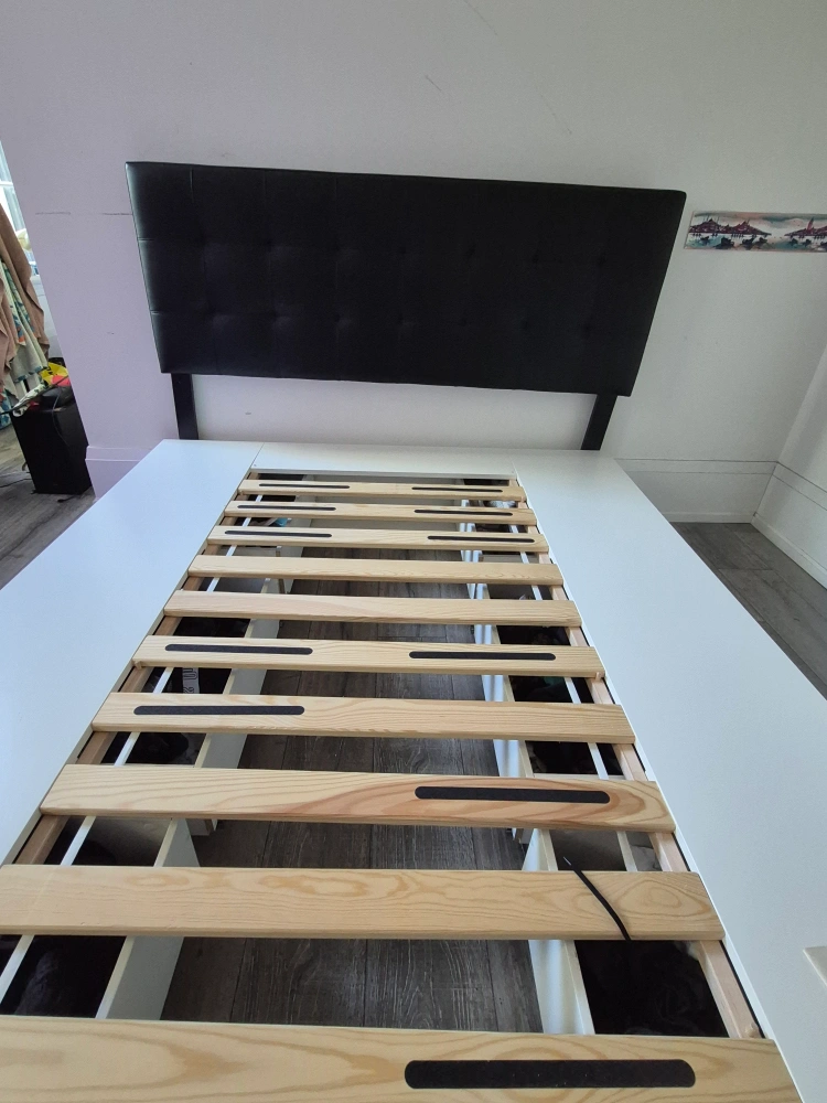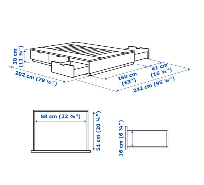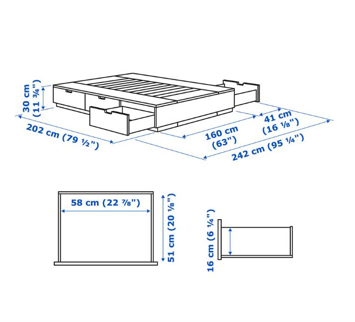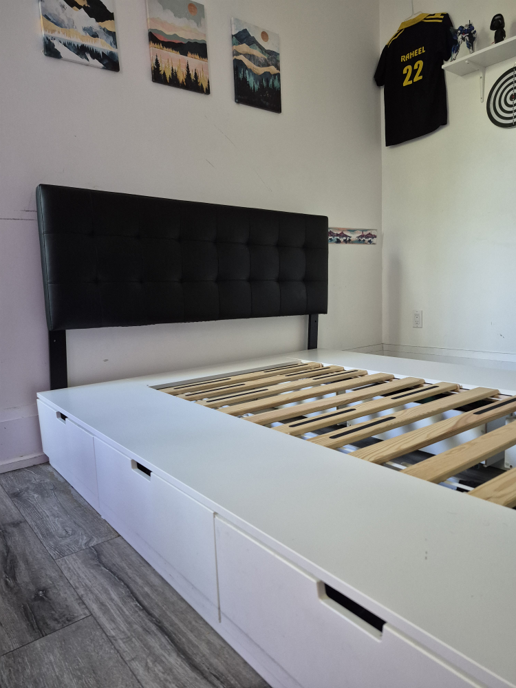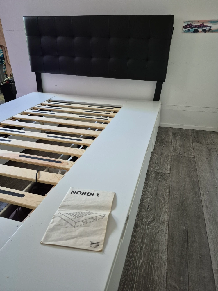 Selling an IKEA Nordli bed frame in queen size. It comes with a black Oliver upholstered headboard. The bed frame has built-in drawers for extra storage. Dimensions are approximately 242 cm (95 1/4") in length and 160 cm (63") in width. The headboard is also queen size.