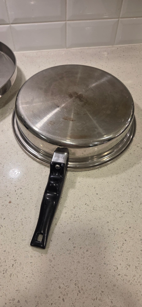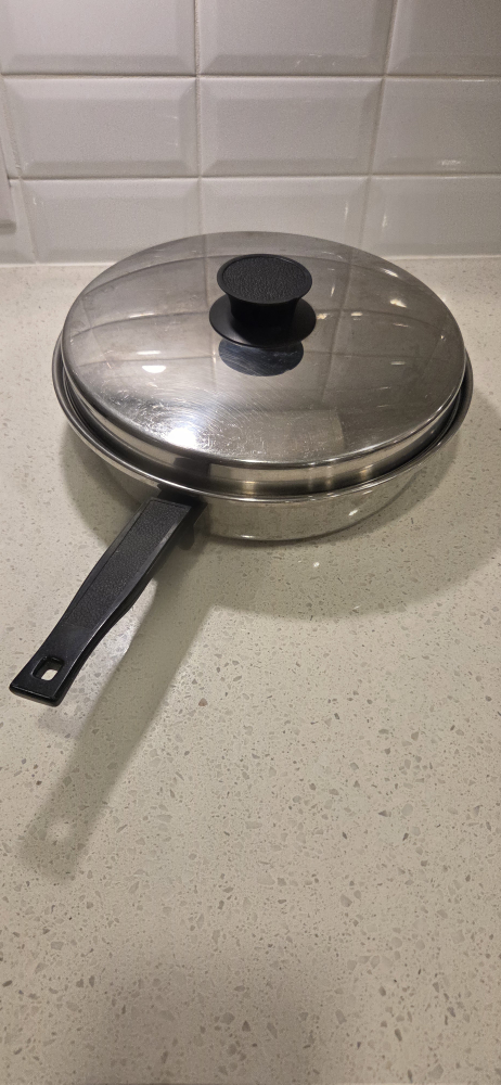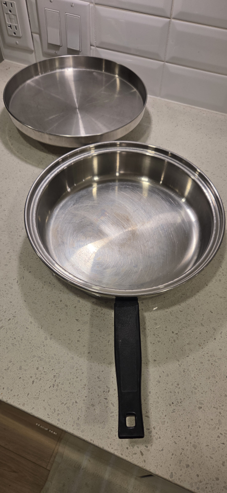 Selling a vintage stainless steel skillet with a lid. It has a black handle, 10" round, and is in like new condition. Perfect for cooking up your favourite meals!