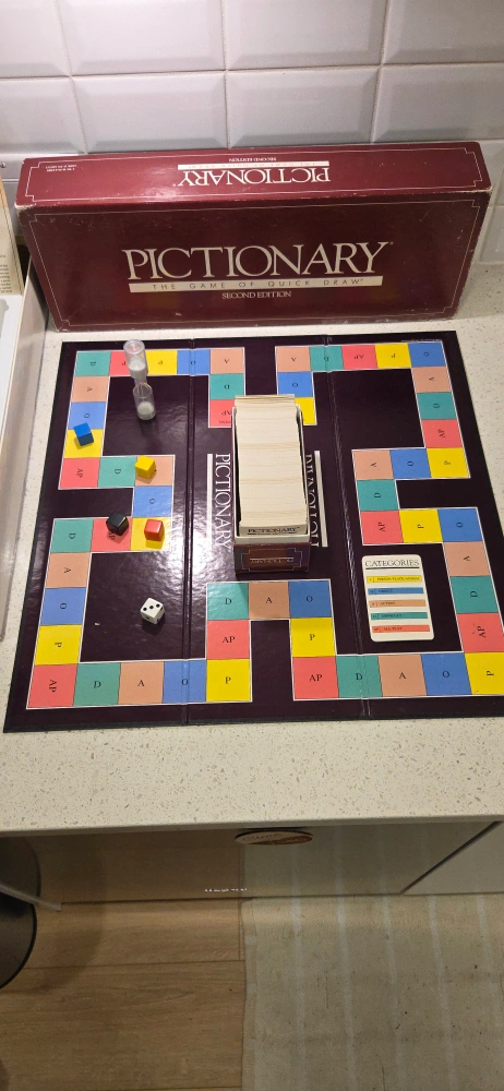 Selling a Pictionary Second Edition board game! Comes with all the pieces you see in the photos, including the board, cards, die, timer, and playing pieces. Perfect for family game night or a fun get-together with friends.