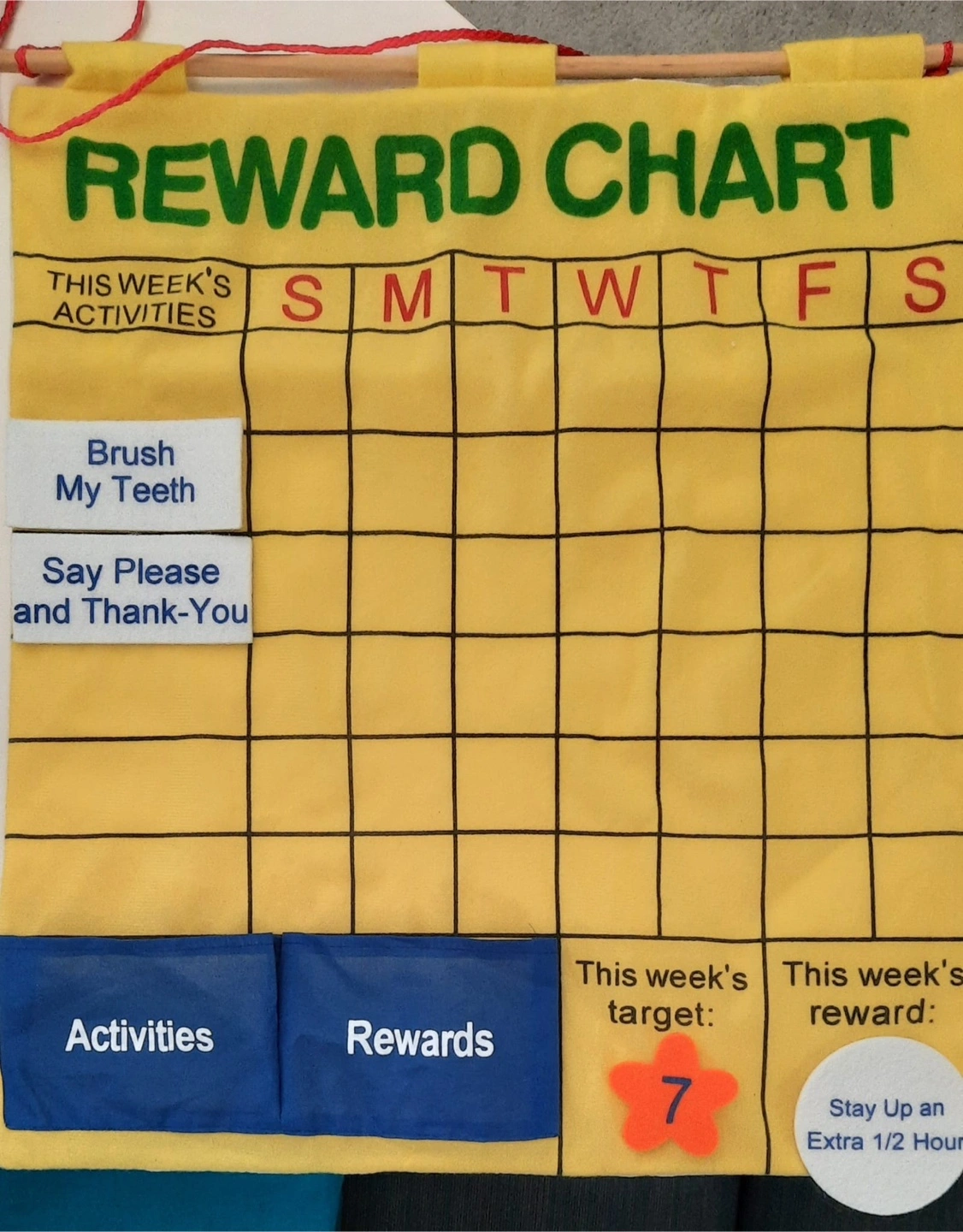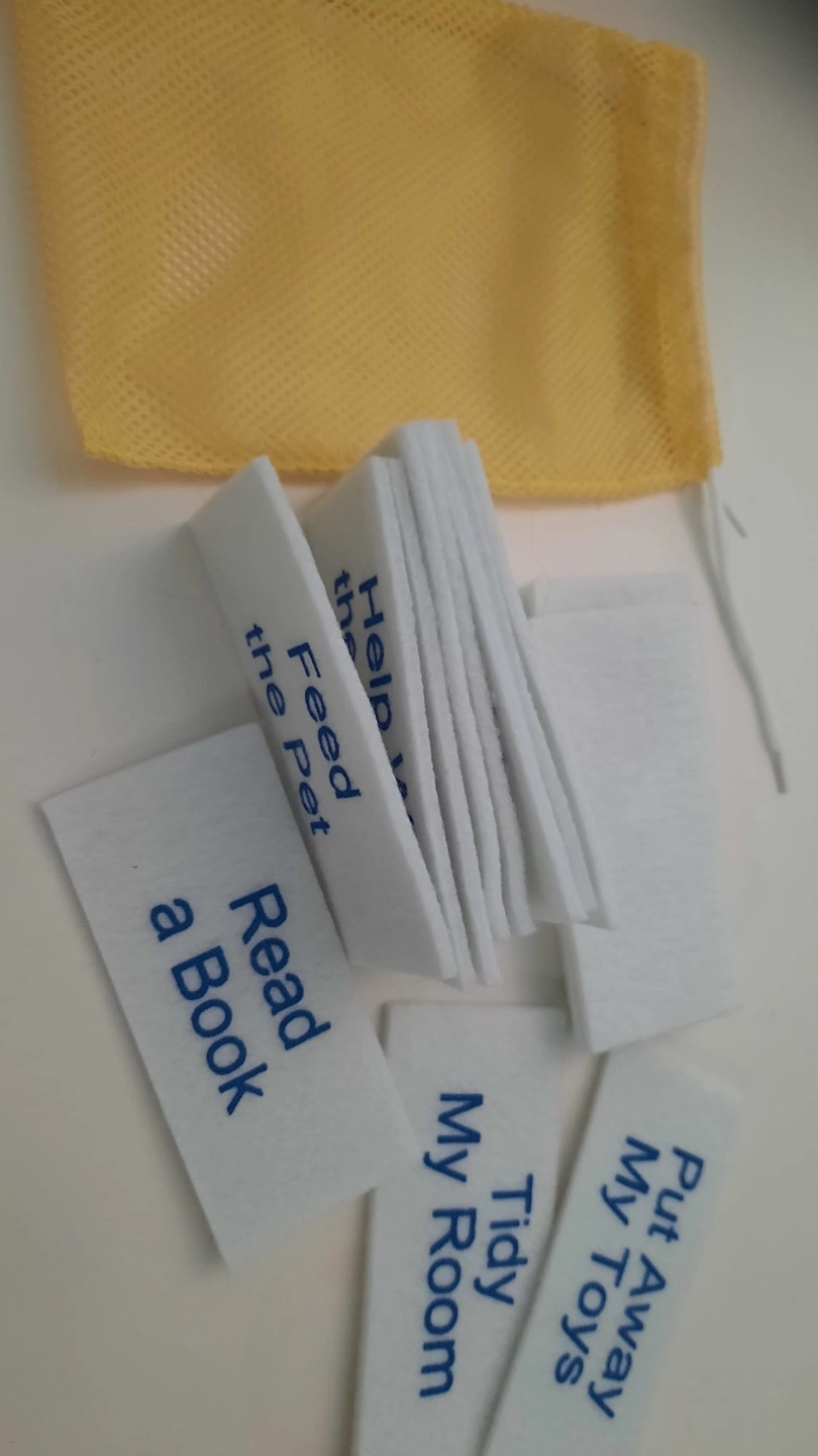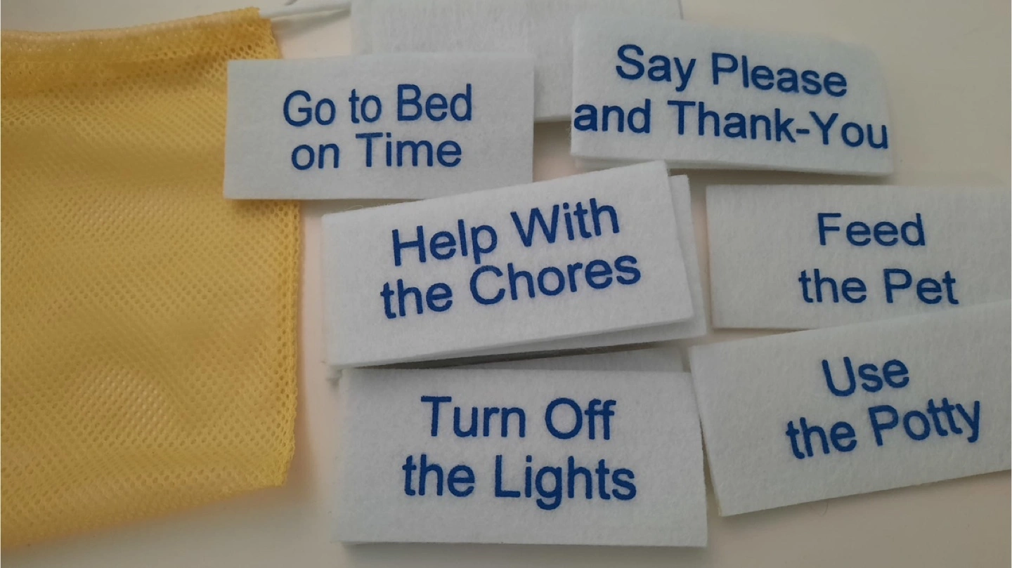 Pick up at Dundas and River. Cash only. A tactile, portable, and fully customizable teaching aid for young learners. Incorporate into setting schedule, and developing healthy routines for kids from toddlers to elementary students. Effective for both neuro-typical and special needs learners because of the bright colors, tactile and visual advantages. Complete with rewards system you can customize to encourage staying on target. System comes with everything shown in photos. Each removable piece is crafted from sturdy precut felt , all backed with velcro to easily stick on fleeced fabric board, which has 2 neatly sewn-in pockets for choice-making. Ready to hang on wall or door of classroom, or bedroom, or mount on side of fridge. Brand new. Comes with 2 drawstring net bags to store the felt cards: suggested targets and rewards, plus numbered and plain markers (70-75 pcs in all).