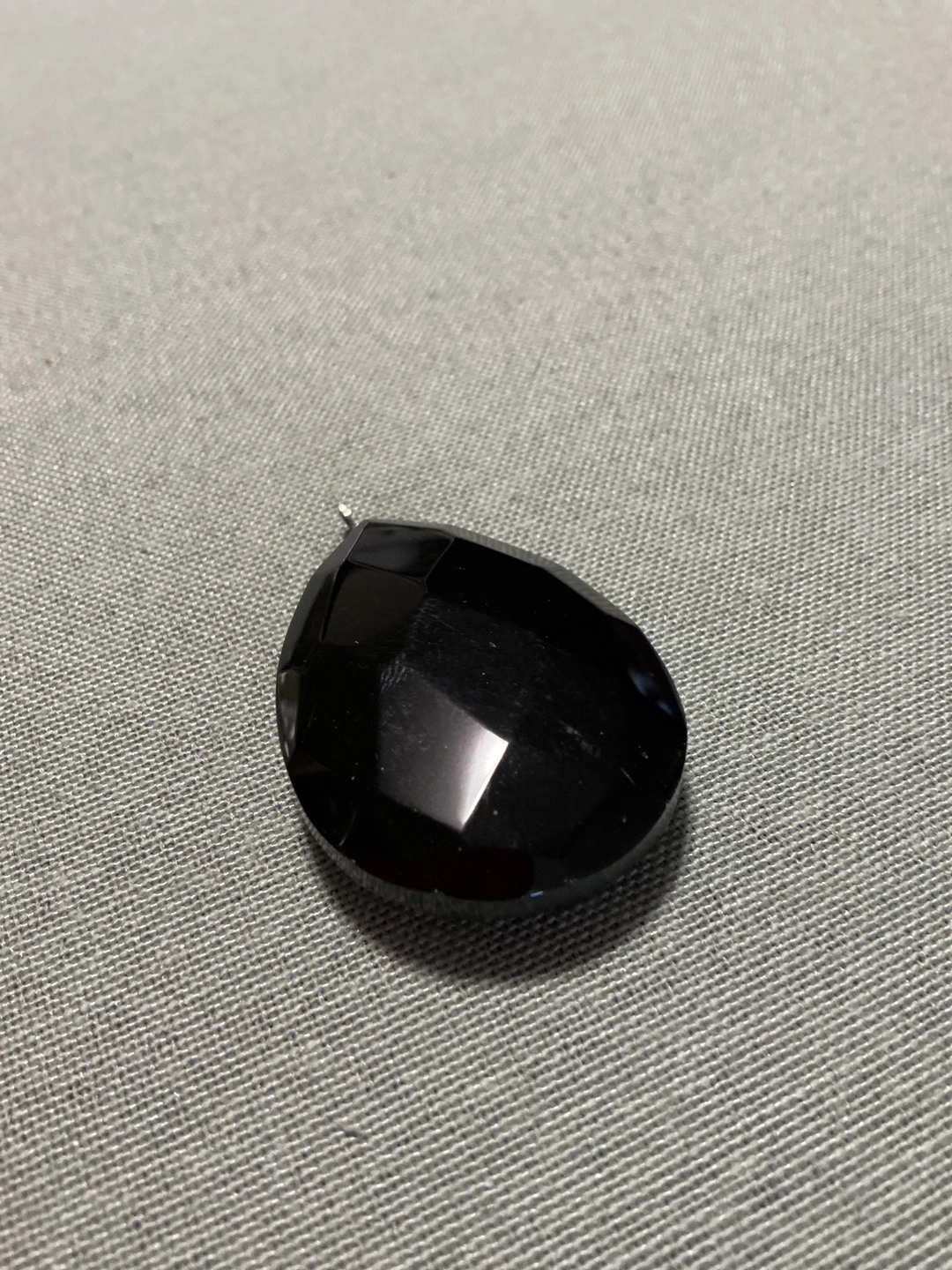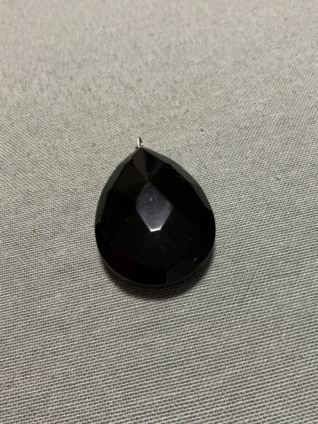 244Here's a lovely black gemstone pendant! It has a teardrop shape with a faceted surface, giving it a nice shine. It's in great condition and would be a beautiful addition to any necklace or jewelry project